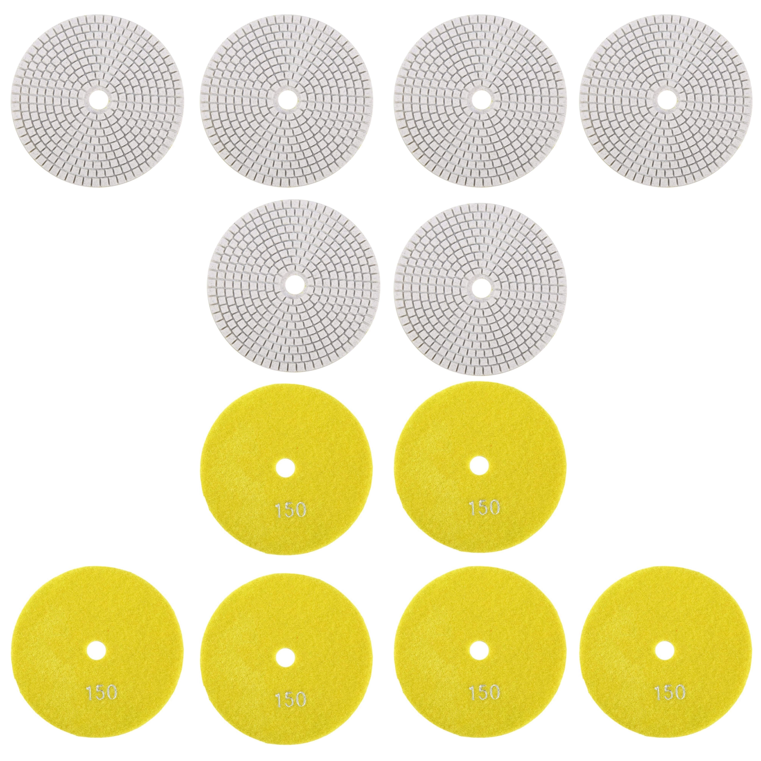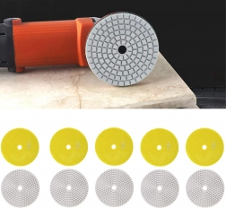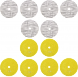 Professzionális 10 darabos, 80 mm átmérőjű gyémánt polírozó korong gyors csiszoláshoz és polírozáshoz greshez, kerámialapokhoz, kőhöz, márványhoz és gránithoz. A korongok száraz és nedves használatra egyaránt alkalmasak, és a tépszáras rögzítésnek köszönhetően gyors cserét és folyamatos munkát tesznek lehetővé magas élettartammal és hatékonysággal.
