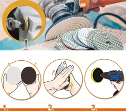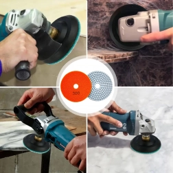 Használható gres járólaphoz, kerámiához, természetes kőhöz, márványhoz és gránithoz. Élekhez és sík felületekhez egyaránt alkalmas, műhelymunkához, szereléshez és felújításhoz. Kompatibilis a szokásos sarokcsiszolókkal és polírozógépekkel megfelelő tépőzáras hordtárcsával.