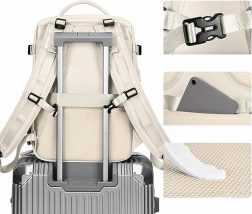 Az integrált pánttal a hátizsák könnyen a bőrönd húzókarára húzható. A légáteresztő hálós, párnázott hátpanel és az állítható vállpántok növelik a kényelmet.