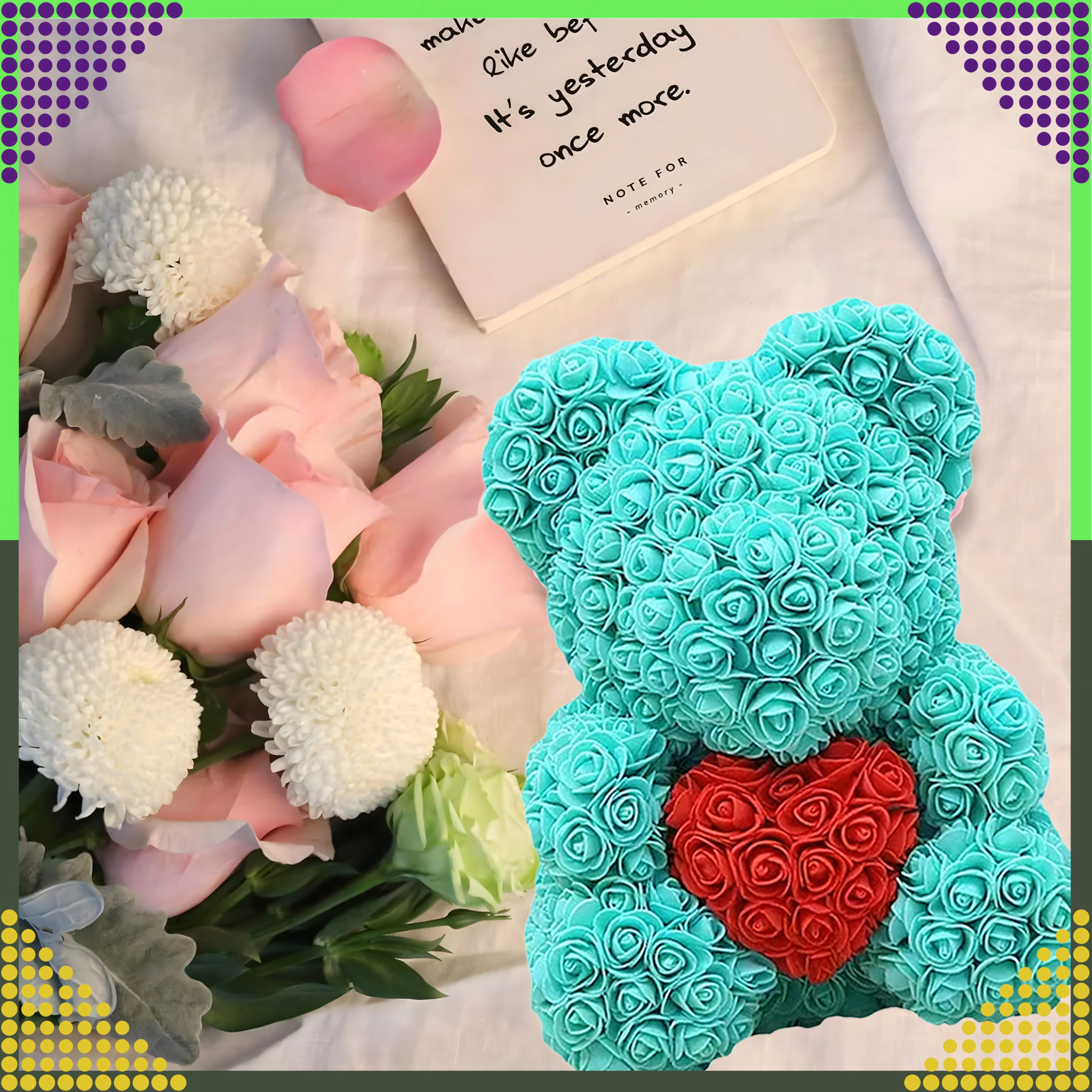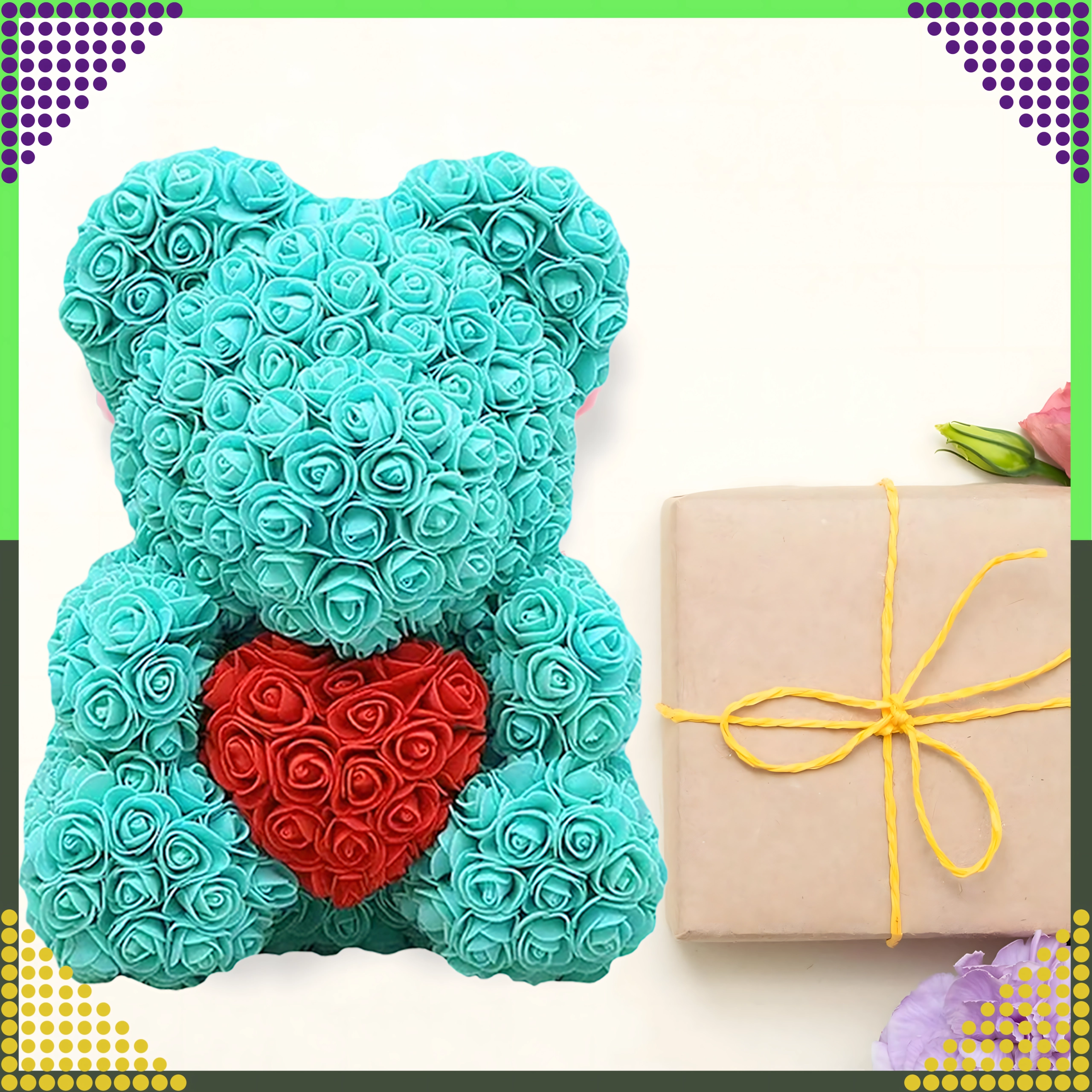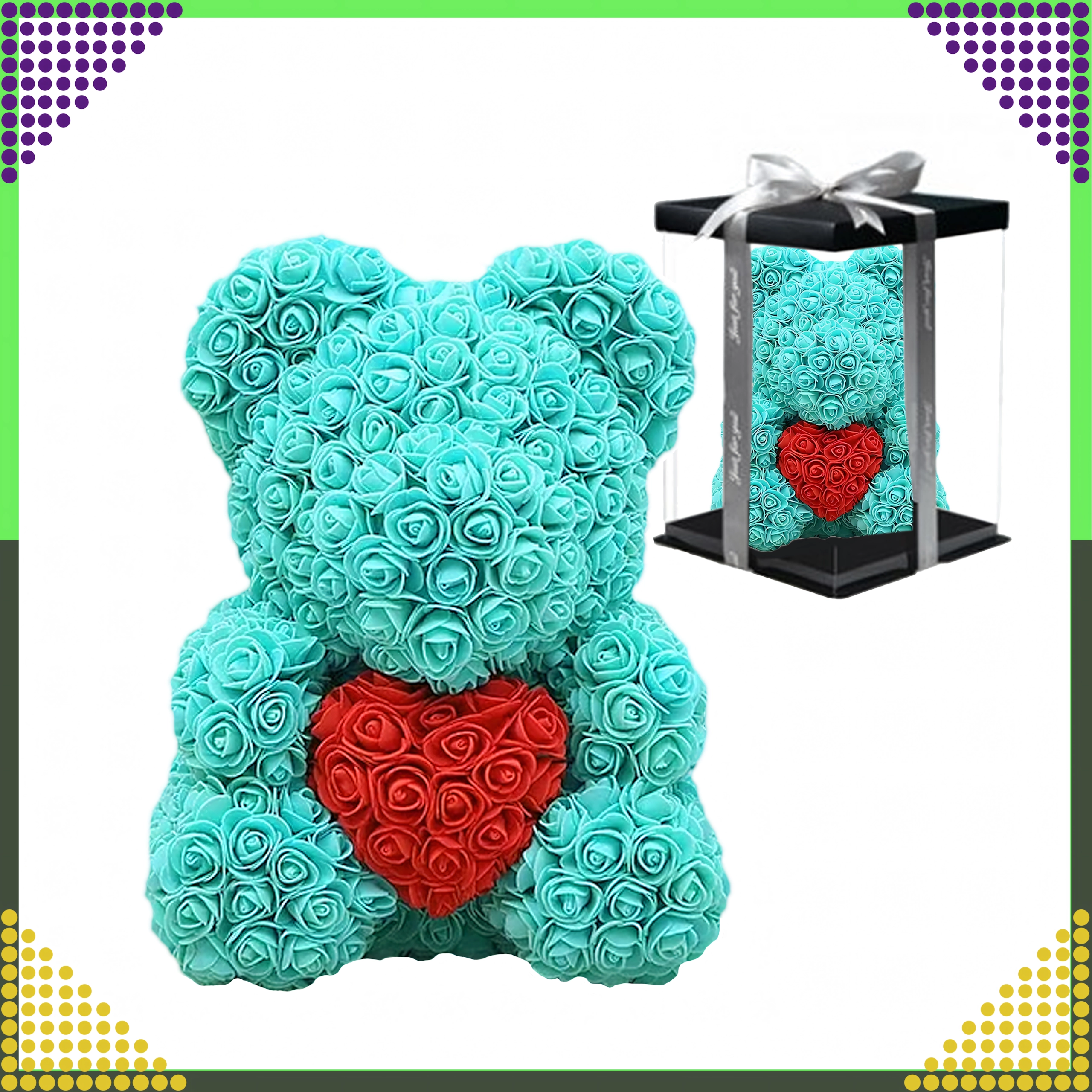 Az elegáns, 40 cm magas rózsamedve egy felejthetetlen, romantikus ajándék a párodnak, édesanyádnak vagy nagymamádnak. Finom, habrózsákból készül, amelyek soha nem hervadnak el, így tartós dekorációként és a szeretet szimbólumaként szolgál Valentin-napon és más különleges alkalmakon is.