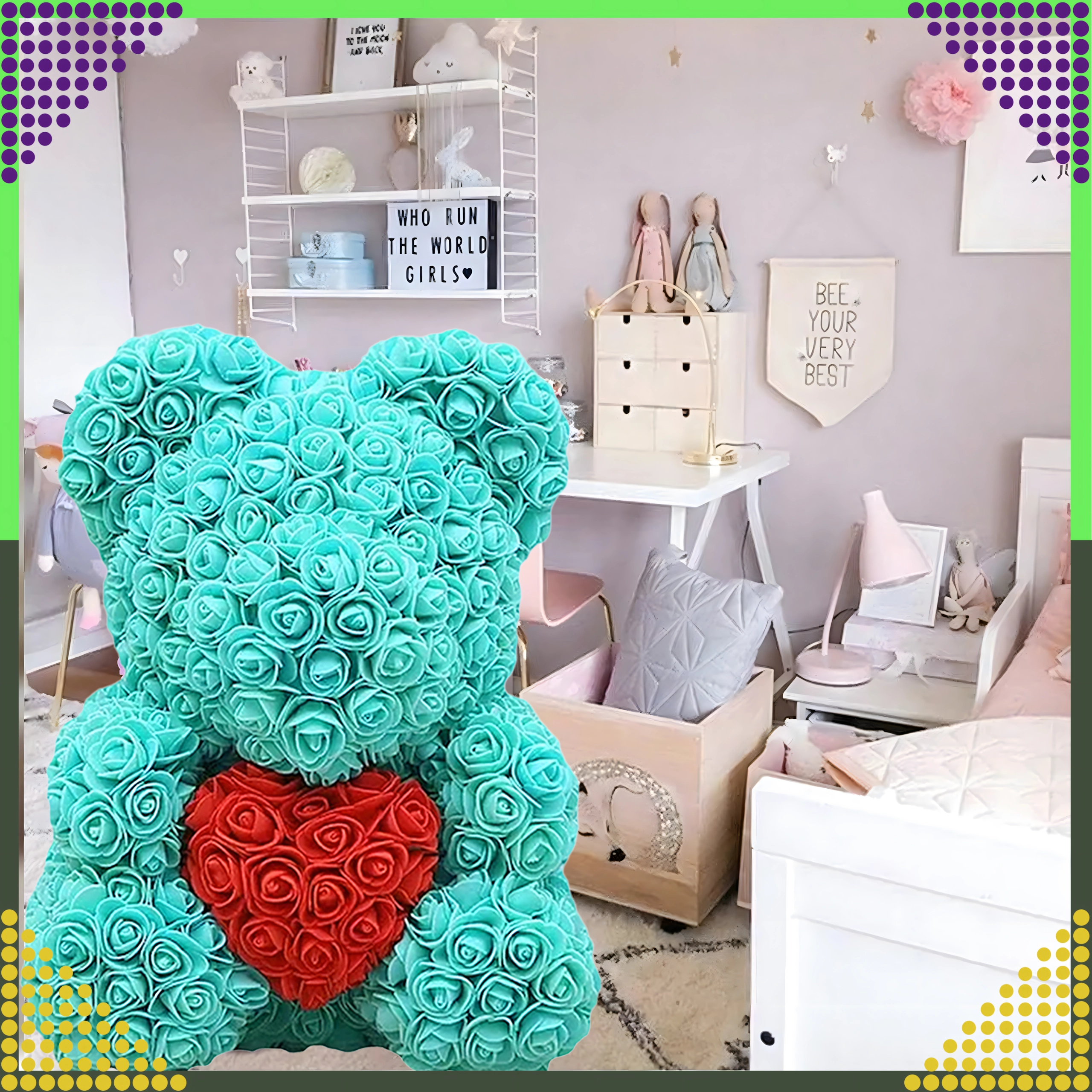 Ajándékozz érzelmeket gyönyörű kivitelben. A rózsamedve kézzel kerül összeállításra számos habvirágból, melyek megőrzik formájukat és színüket. Ennek köszönhetően stílusos és strapabíró dekoráció a hálószobába, nappaliba vagy akár az ünnepi asztalra.