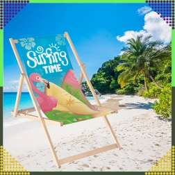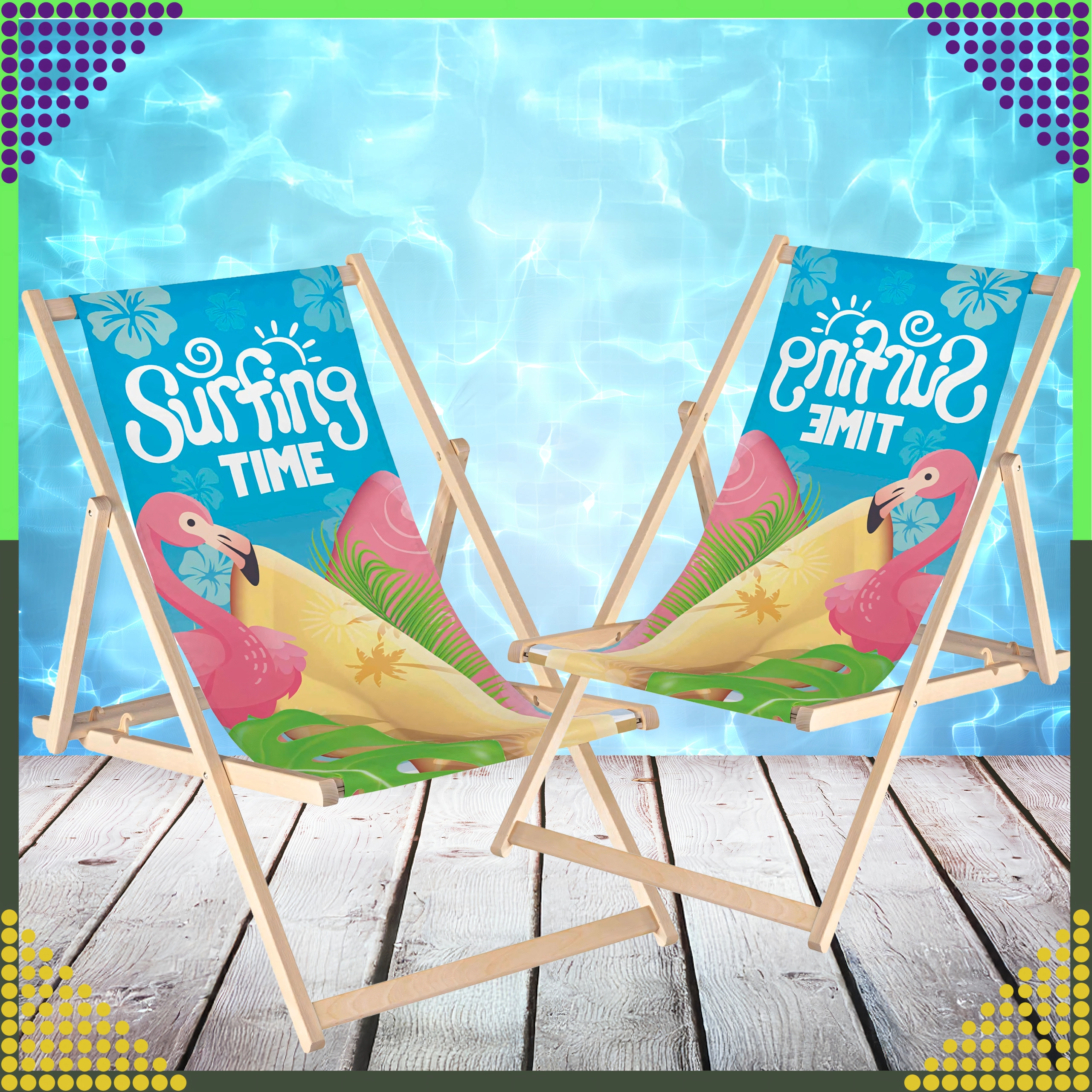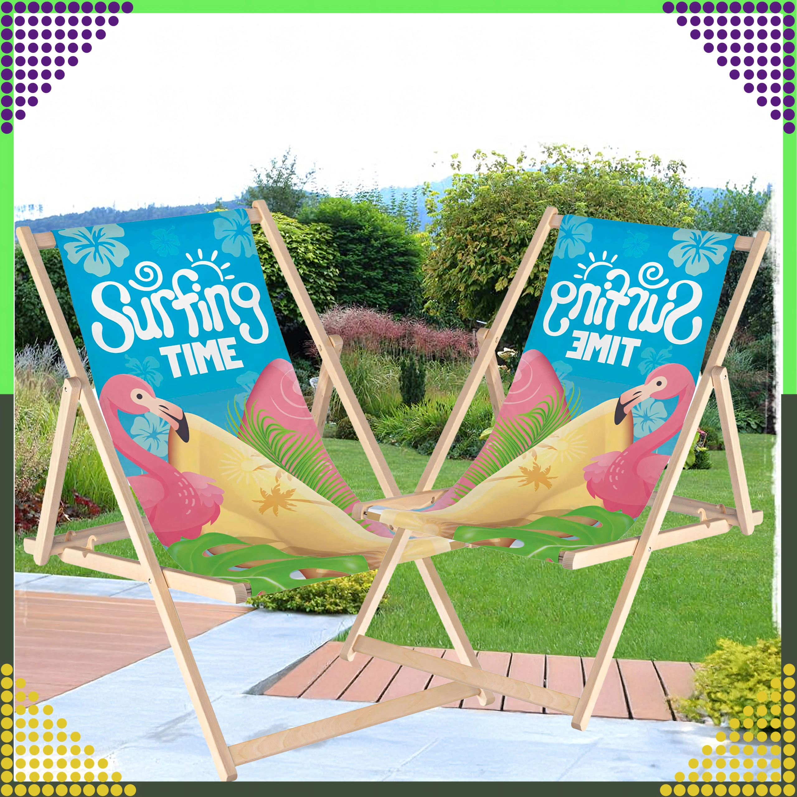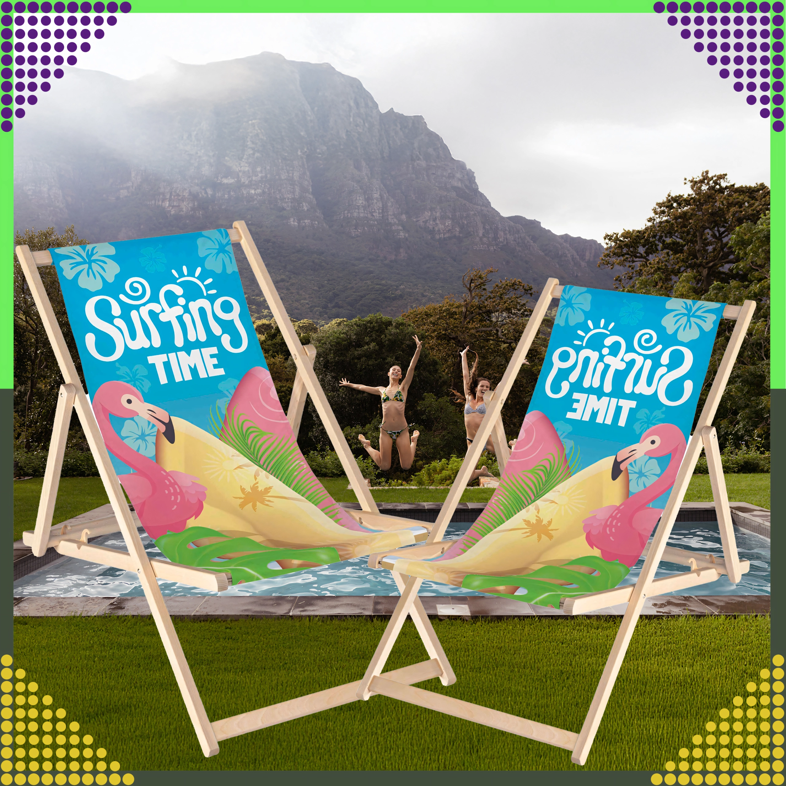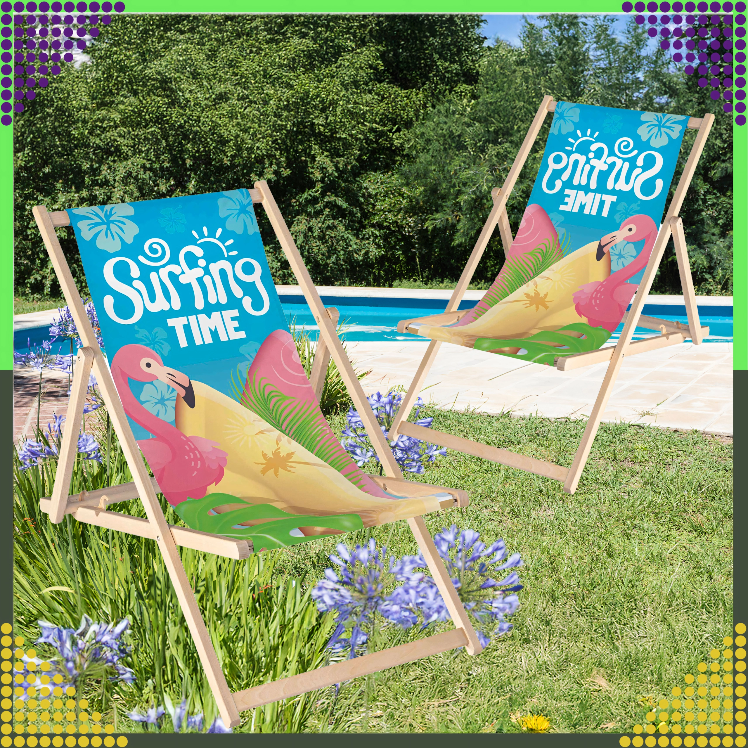 A két darabos összecsukható nyugágy szett a természetes fát kombinálja tartós vászon textillel és „Surfing Time” flamingós, színes nyomattal. A többpozíciós mechanizmusnak köszönhetően könnyedén beállítható a kényelmes ülő- vagy fekvőszög. A könnyű szerkezet egyszerű hordozást és tárolást tesz lehetővé otthon és utazás közben is.