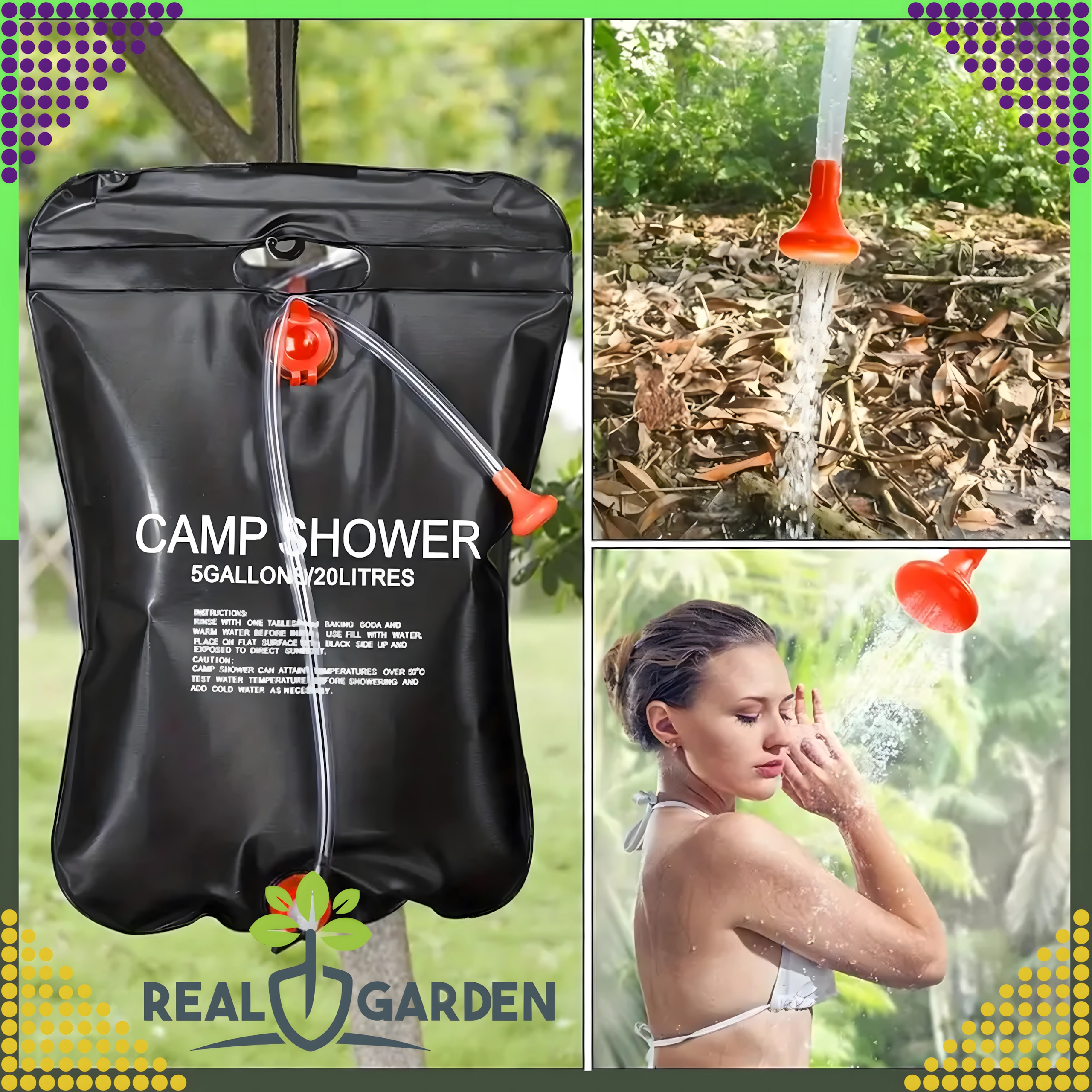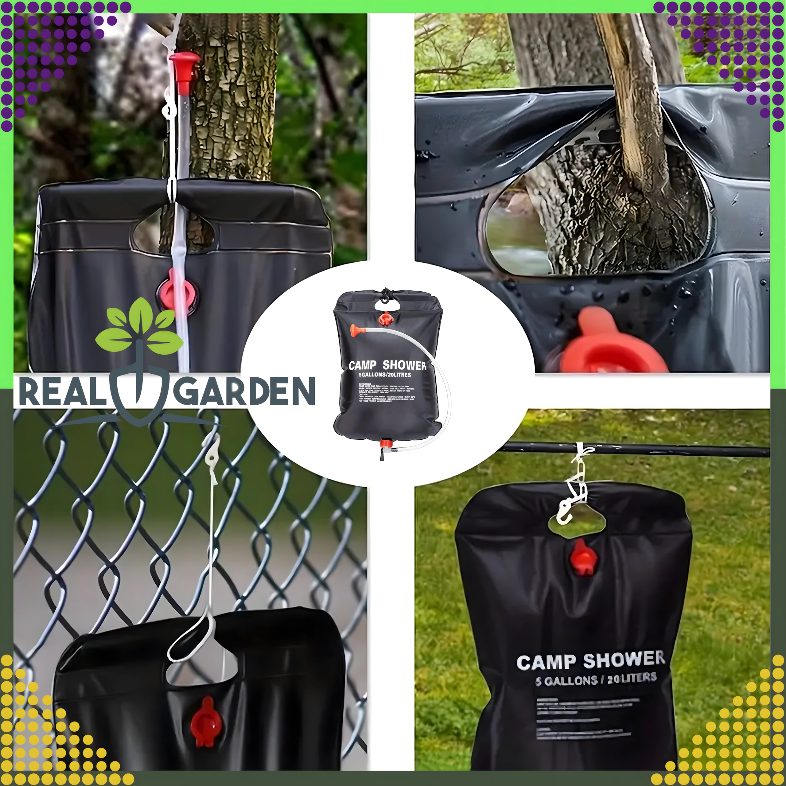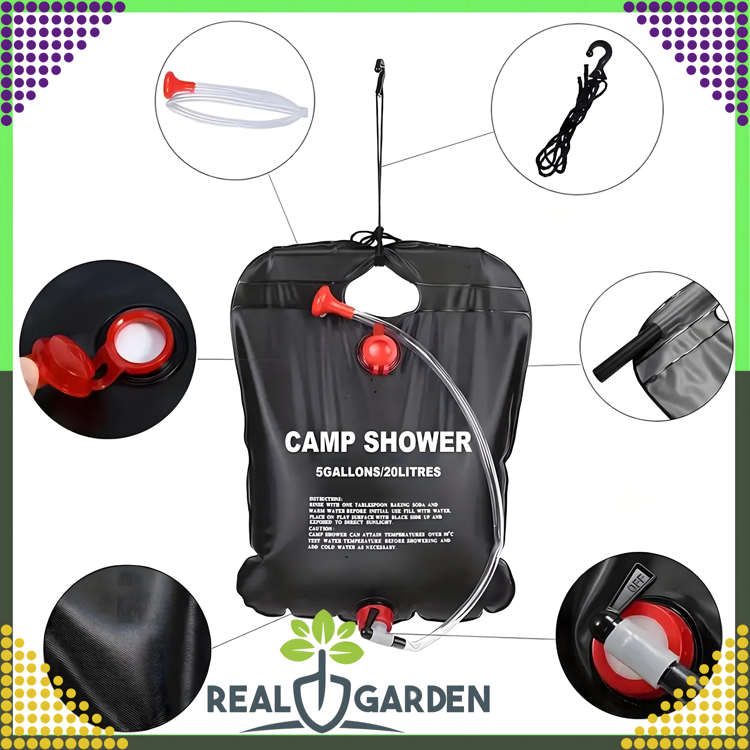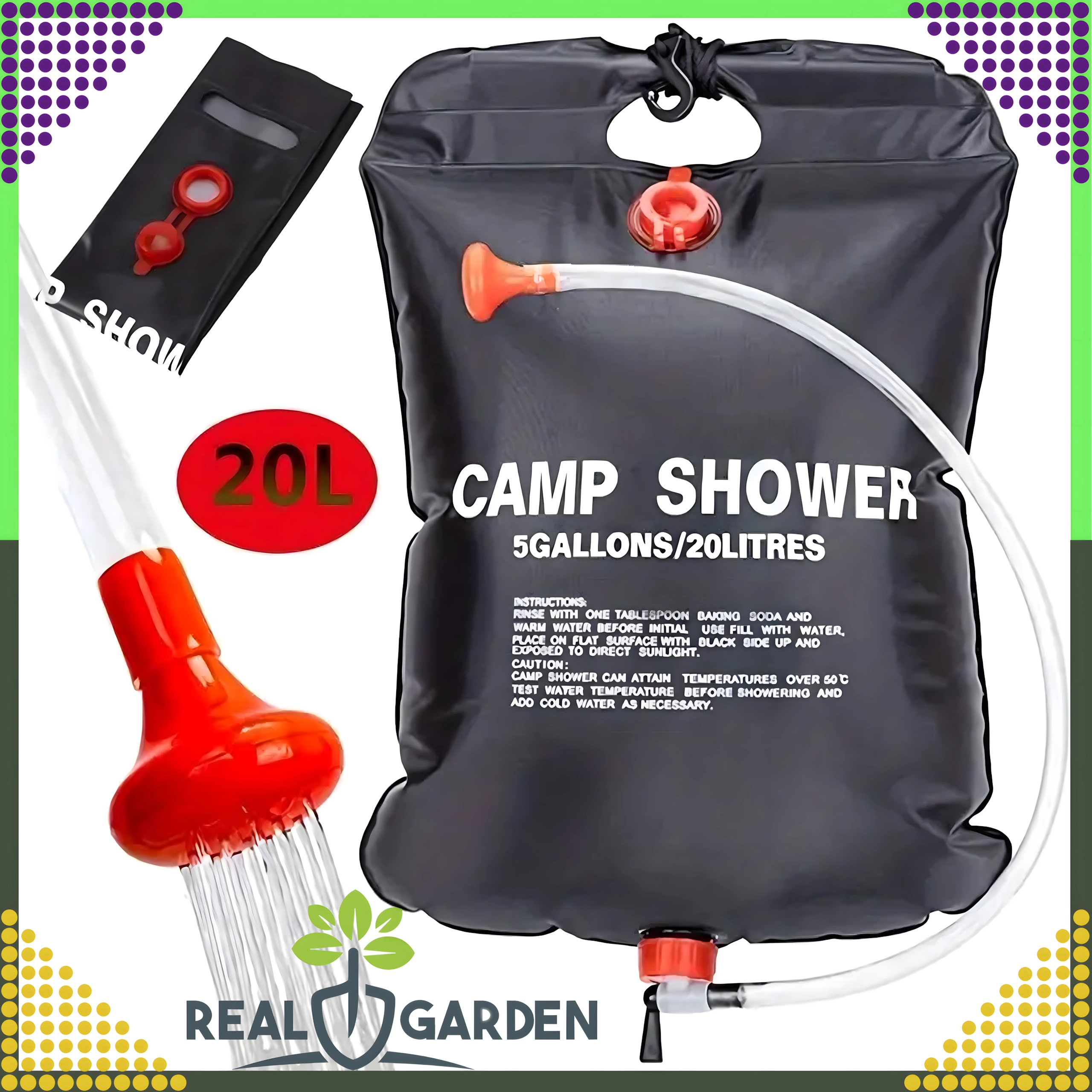 A zuhany erős akasztófüllel és praktikus zuhanyfejjel van felszerelve, ami kényelmes használatot biztosít a kempingben, vízparton vagy a kertben.
