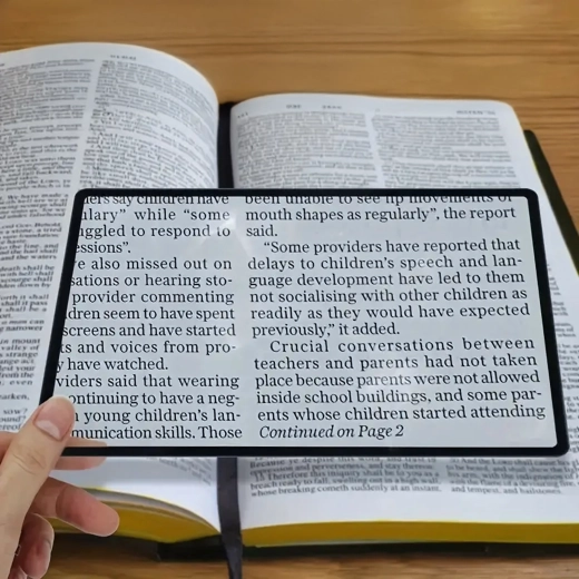Ultravékony és könnyű oldallap nagyító 12 × 18 cm méretben, amely akár 200% nagyítást biztosít a kényelmes olvasáshoz. Ideális könyvekhez, újságokhoz, térképekhez és dokumentumokhoz, könnyen elfér a táskában, és tökéletes utazáshoz és mindennapi használatra.