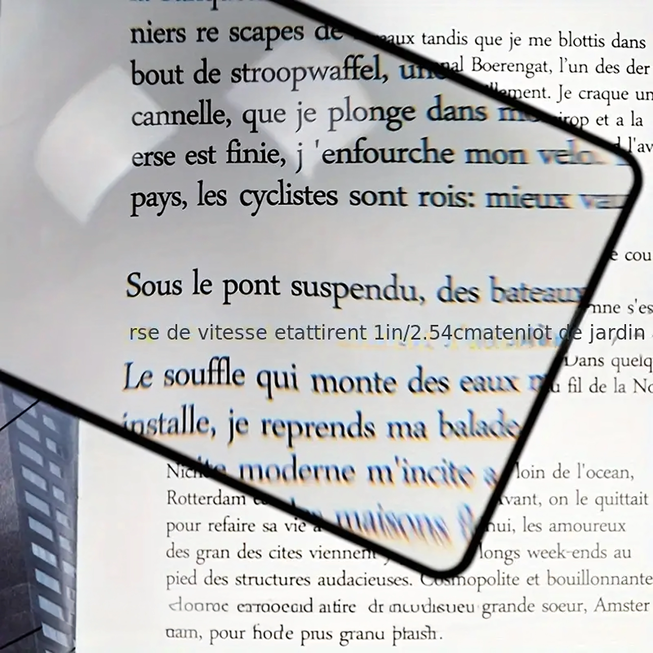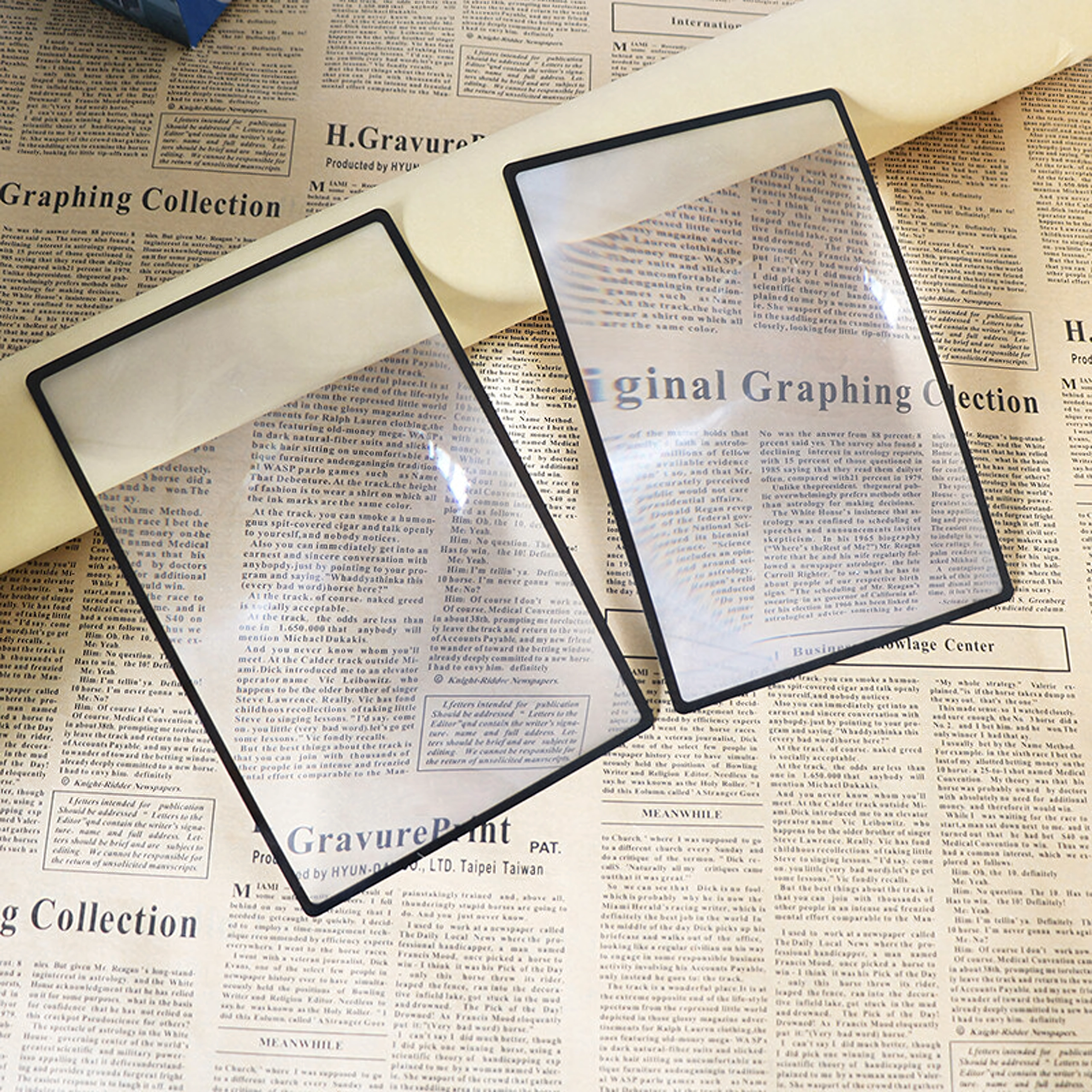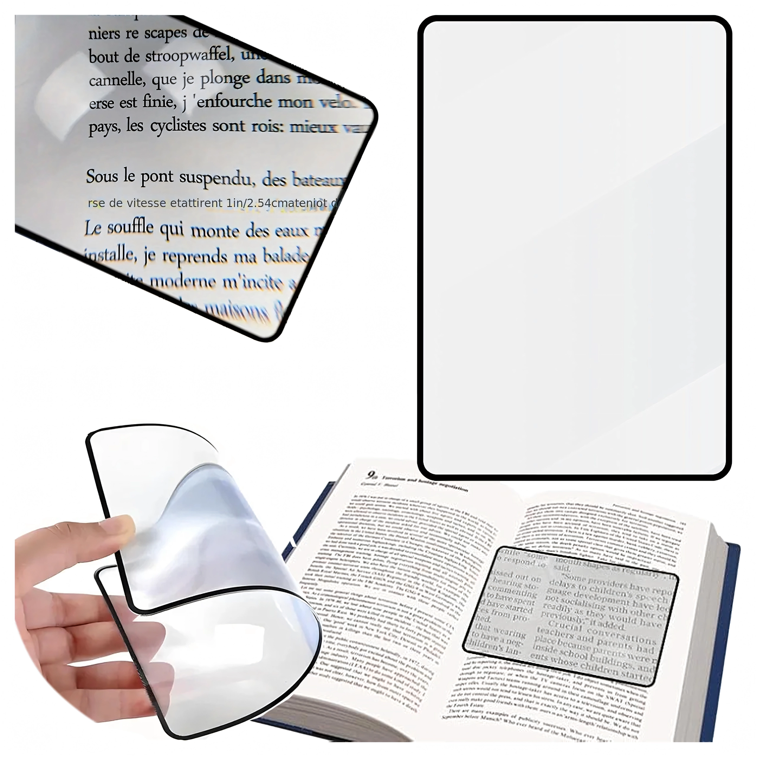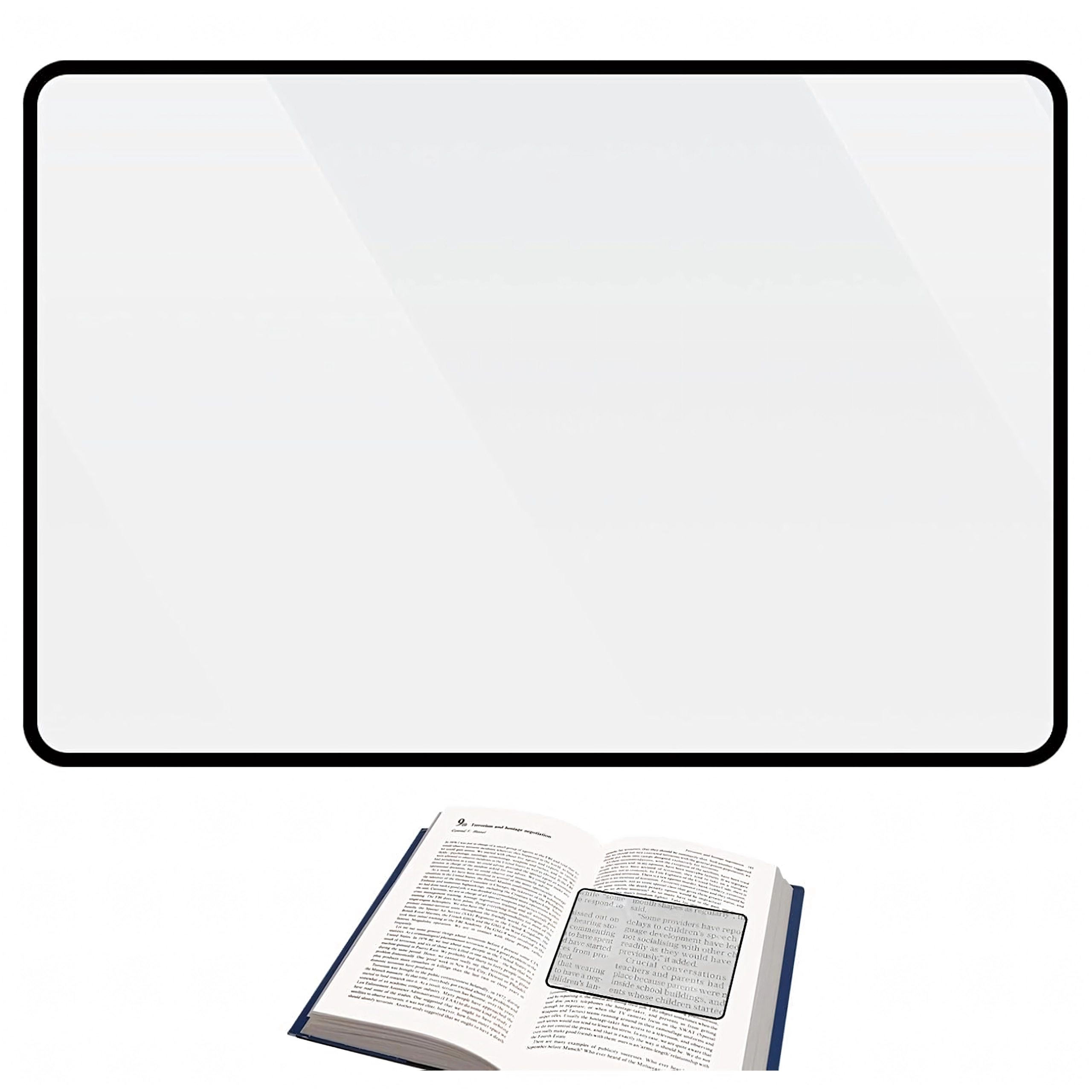 A téglalap alakú lencse a lap nagy részét lefedi, így a szöveg nagyítva látható a nagyító állandó mozgatása nélkül.