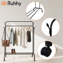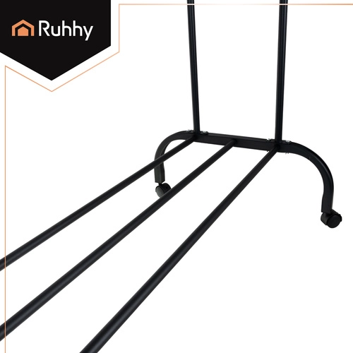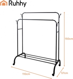 Vége a rendetlenségnek az előszobában vagy a gardróbban. A RUHHY gurulós ruhafogas két masszív akasztórúddal, alsó cipőpolccal és oldalsó kampókkal kínál helyet a kiegészítőknek. A fékezhető forgókerekeknek köszönhetően könnyen áthelyezhető, míg a stabil vas szerkezet mindent a helyén tart.