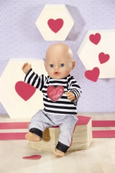 A Dolly Moda ruhái úgy készülnek, hogy könnyen kombinálhatók és cserélgethetők legyenek különböző babák között. Ez a csíkos melegítő szett pulóverrel és nadrággal ideális a kényelmes otthoni játékhoz és a babák stílusos kiruccanásaihoz. A fekete-fehér csíkon díszelgő feltűnő szív, valamint a visszafogott szürke nadrág kontrasztos részletei modern megjelenést kölcsönöznek az öltözéknek.