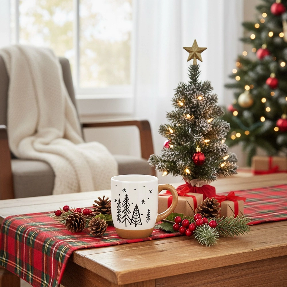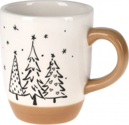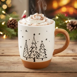 Vigyen ünnepi hangulatot otthonába az elegáns kerámia bögrével, melyet minimalista fenyőfák díszítenek. A fehér máz és a bézs fül és talp kombinációja ízléses és időtálló, így a bögre bármilyen terítékhez illik.