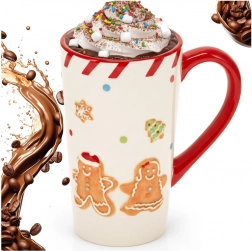 Stílusos karácsonyi bögre mézeskalács figurákkal és piros füllel, amely örömet szerez a nagy adag forró italok kedvelőinek. Nagy, 570 ml-es kapacitással, kényelmes, ergonomikus füllel készül, minőségi kerámiából. Ideális teához, kávéhoz és forró csokihoz, valamint gyönyörű ajándék a téli időszakra.