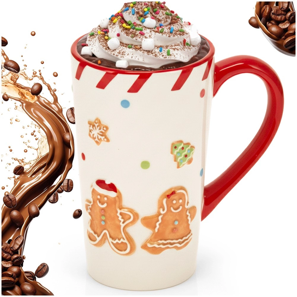 Vigyen ünnepi hangulatot otthonába a magas kerámia bögrével, amelyet domború mézeskalács, hópehely és karácsonyfa motívumok díszítenek. A kontrasztos piros fül és perem karakteres megjelenést ad, míg a magas forma bőkezű, 570 ml-es kapacitást kínál kedvenc meleg italaihoz.