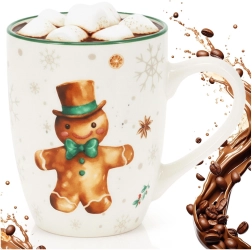Ez a bájos, ünnepi porcelán bögre fehér színben vidám mézeskalács-figurával és finom hópelyhekkel díszített. A klasszikus forma és a kényelmes fül kellemes fogást biztosít, így ideális a mindennapi használatra az ünnepi szezonban és az év bármely szakában.