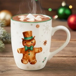 Élvezze a téli hangulatot ezzel a porcelán bögrével, mézeskalács-figurás mintával. 320 ml űrtartalommal, kényelmes füllel a könnyű fogásért és elegáns zöld peremmel rendelkezik. Mosogatógépben és mikrohullámú sütőben is használható, tökéletes kávéhoz, teához és forró csokihoz is.