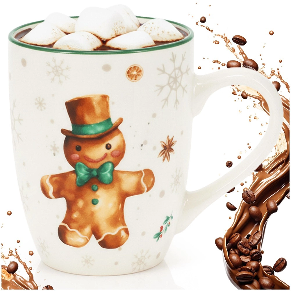 A bájos mézeskalács-figura és a hópelyhek zöld szegéllyel ünnepi hangulatot varázsolnak minden csészéhez.