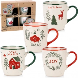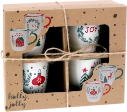 Stílusos, négy darabból álló karácsonyi bögreszett tartós kőedényből, 180 ml űrtartalommal, amely ünnepi hangulatot varázsol otthonába. Minden bögre más motívummal és felirattal rendelkezik: XMAS, LET IT SNOW, JOY és STAY WARM, kényelmes füllel és kellemes krém színű, pöttyös hatású mázzal. A bögrék kiválóan tartják a hőt, mosogatógépben és mikrohullámú sütőben is használhatók, és ajándékcsomagolásban érkeznek – tökéletes karácsonyi ajándékötlet.