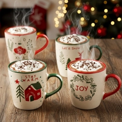 Minden bögre más téli feliratot és grafikát visel, amelyek varázslatos hangulatot teremtenek minden kortynál.