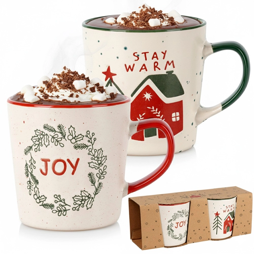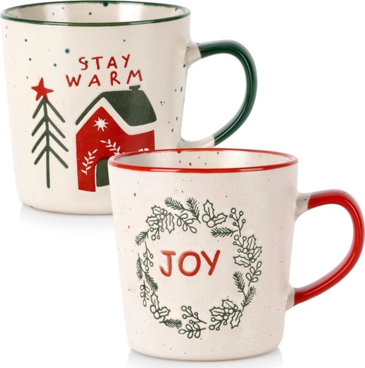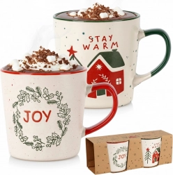 Vigyen ünnepi hangulatot otthonába ezzel a két darabból álló, 350 ml űrtartalmú kerámia bögreszettel. A stílusos, bézs bögrék JOY és STAY WARM feliratú motívumokkal, piros és zöld színű peremmel és füllel készültek, remekül tartják a hőt, és mosogatógépben és mikrohullámú sütőben is használhatók. Ajándékcsomagolásban szállítva – ideális karácsonyi ajándék.
