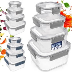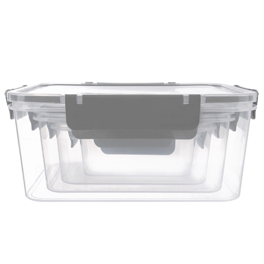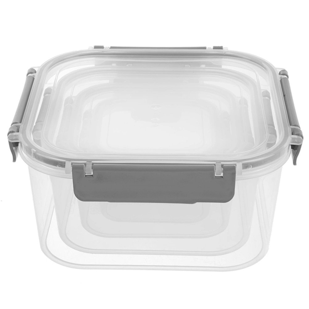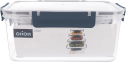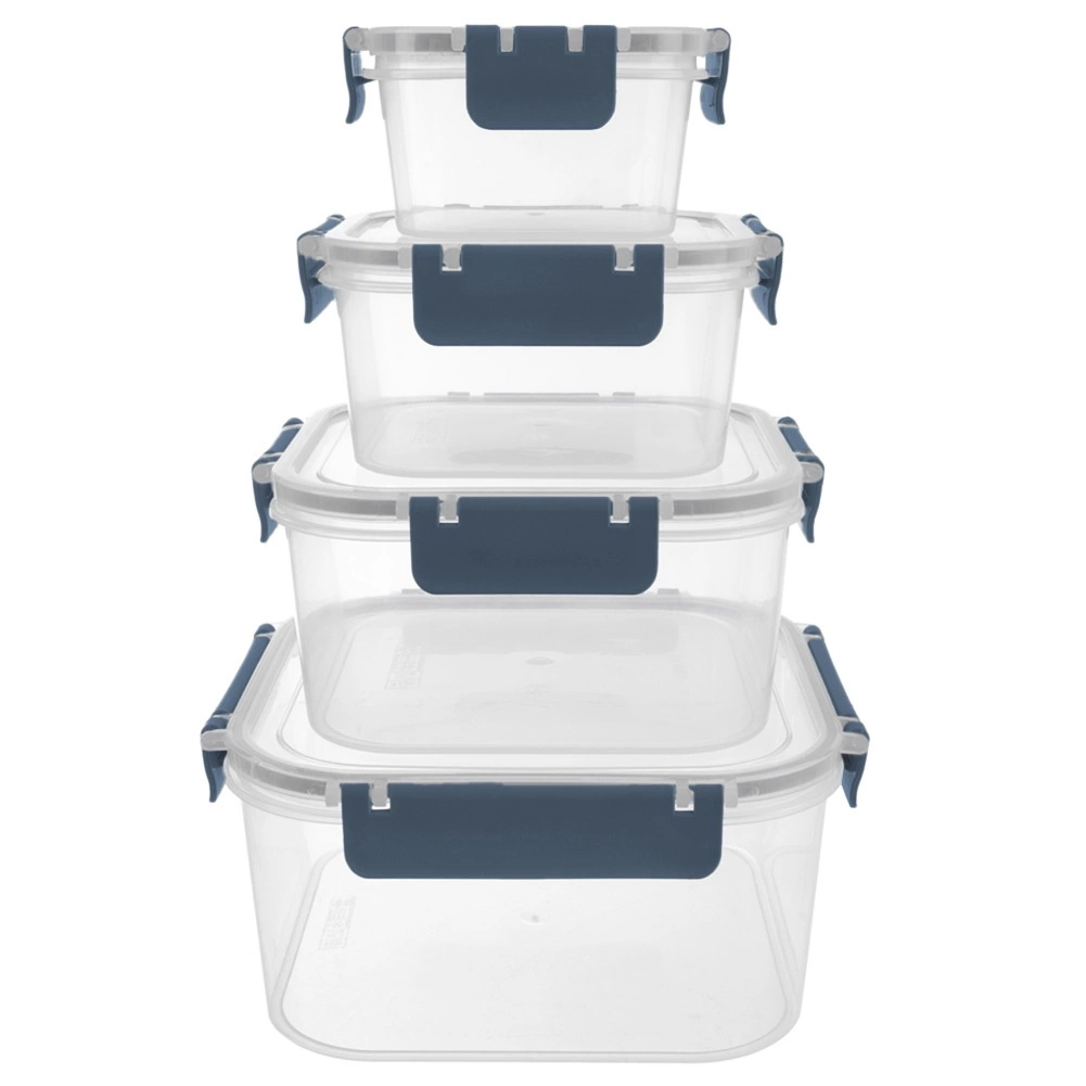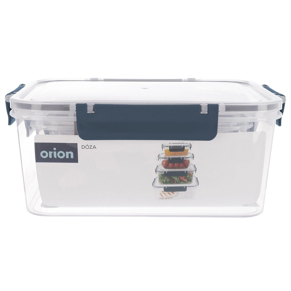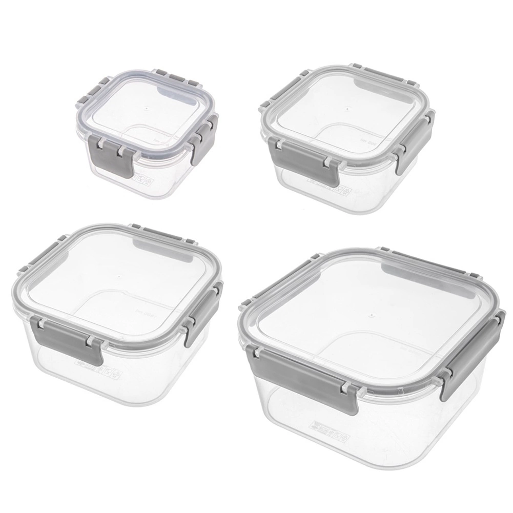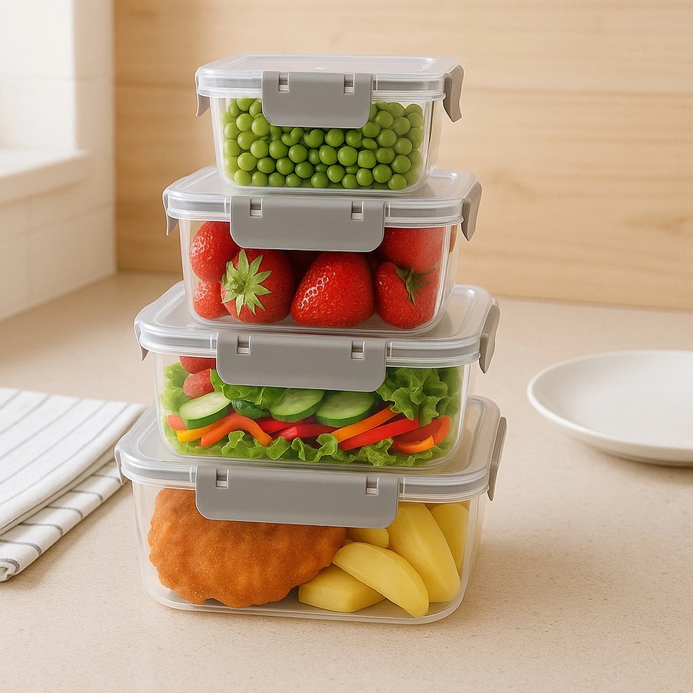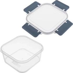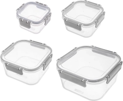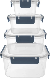 Praktikus készlet négy átlátszó ételtároló dobozzal, tetővel és szilikon tömítéssel, amely hosszabb ideig frissen tartja az ételeket. A dobozok légmentesen záródó, négy klippel ellátott tetővel rendelkeznek, egymásra rakhatók és egymásba tehetők a helytakarékosság érdekében, valamint BPA-mentesek. Alkalmasak mosogatógépbe, fagyasztóba és mikrohullámú sütőben melegítésre (tető nélkül).