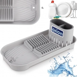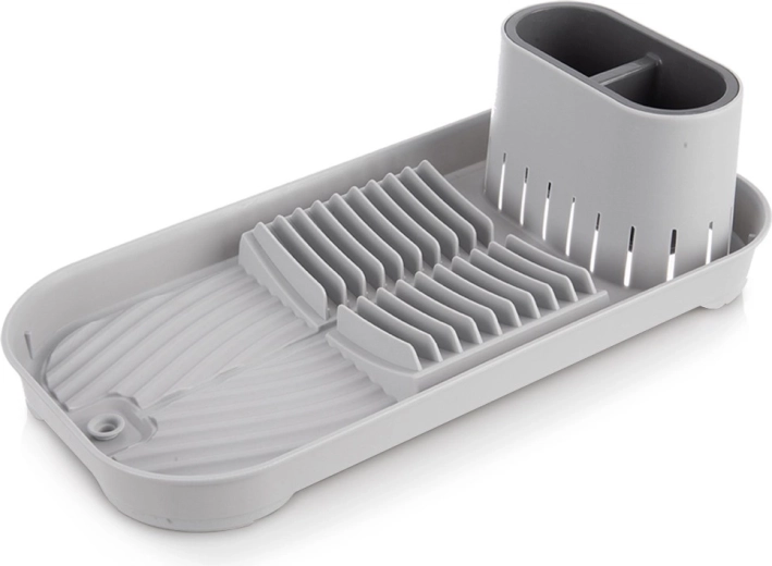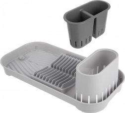 Az alsó rész bordázott felülete és a zárókupakkal ellátott beépített lefolyó hatékonyan elvezeti a vizet, így nincs szükség külön csepegtetőtálcára. A csúszásgátló elemek stabilitást biztosítanak és megakadályozzák az elmozdulást használat közben. A szárító tartós, szürke műanyagból készült, könnyen karbantartható és készen áll a mindennapi használatra.