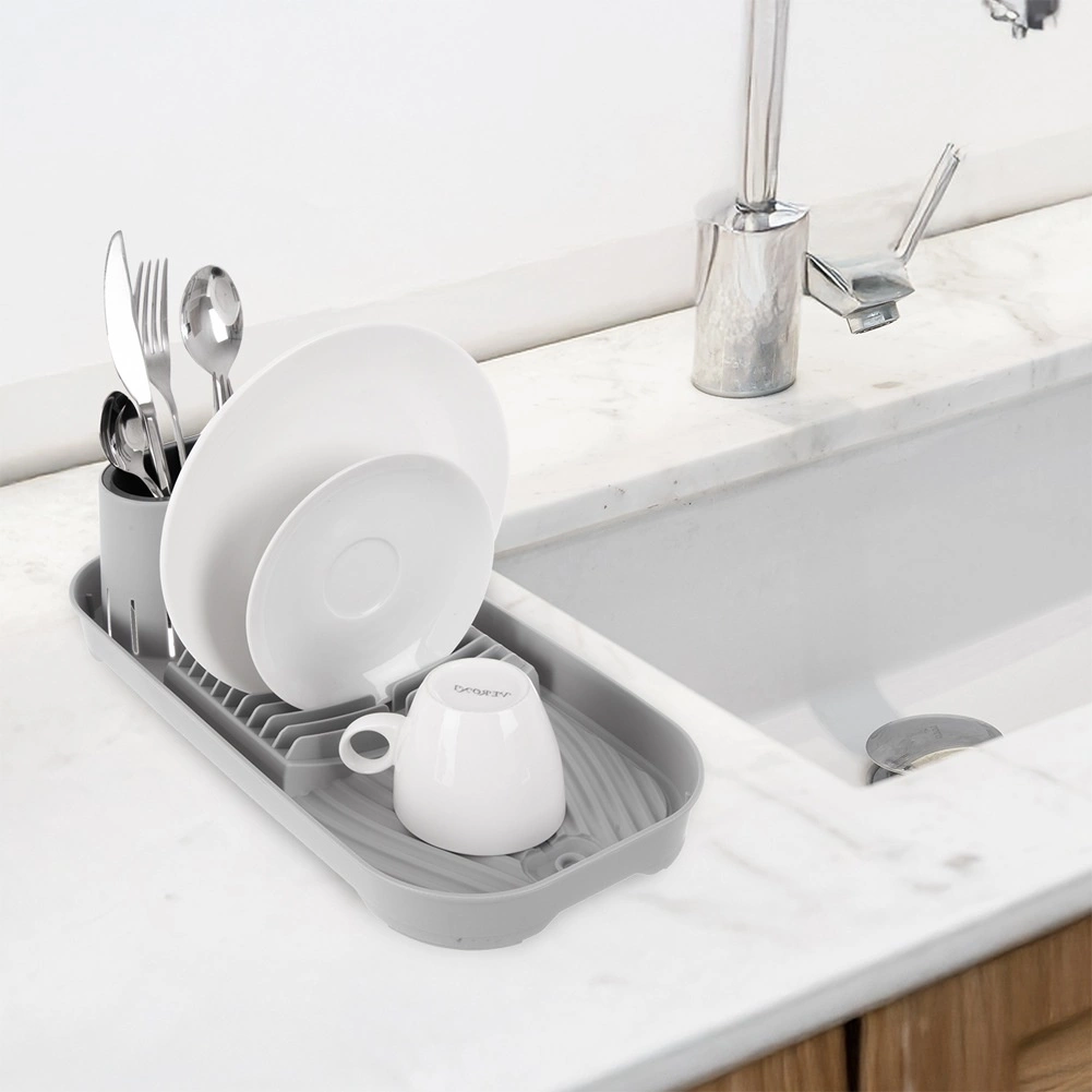 A praktikus edényszárító ideális kisebb konyhákba, apartmanokba vagy lakóautókba. Átlátható szárítást kínál tányérokhoz, poharakhoz és evőeszközökhöz, miközben kompakt méretével helyet takarít meg a pulton. A kivehető, kétrekeszes evőeszköztartó megkönnyíti a rendszerezést és a tisztítást.