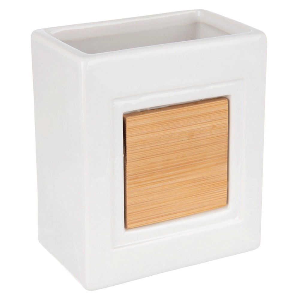 Fényes fehér felület bambusz panellel elegáns megjelenéssel, kézközelben tartja a fogkeféket és az apróságokat.