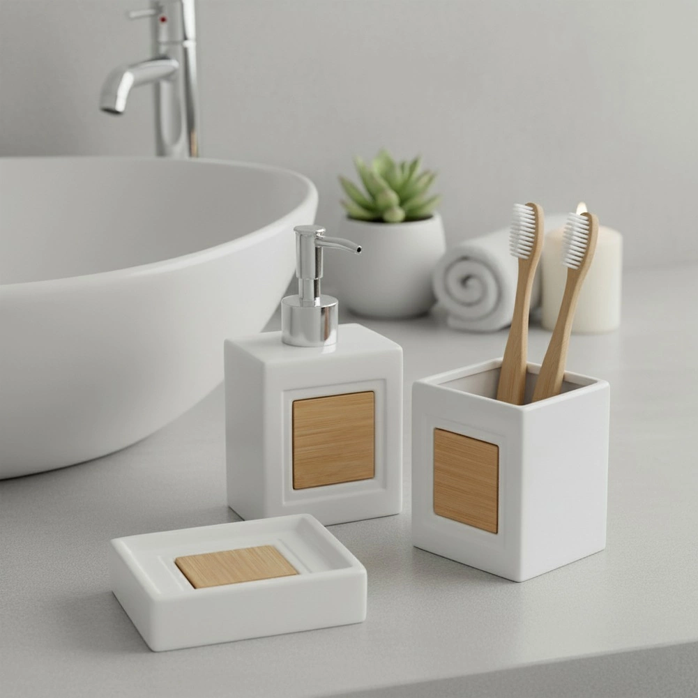 Ez a design szett harmonizálja a mosdókörnyezetet, és tiszta, modern megjelenést kölcsönöz. A minőségi, fényes fehér dolomitot természetes bambusz akcentus egészíti ki, amely meghitt hangulatot teremt bármely fürdőszobában. A praktikus méretek és az átgondolt részletek megkönnyítik a mindennapi használatot és a karbantartást.