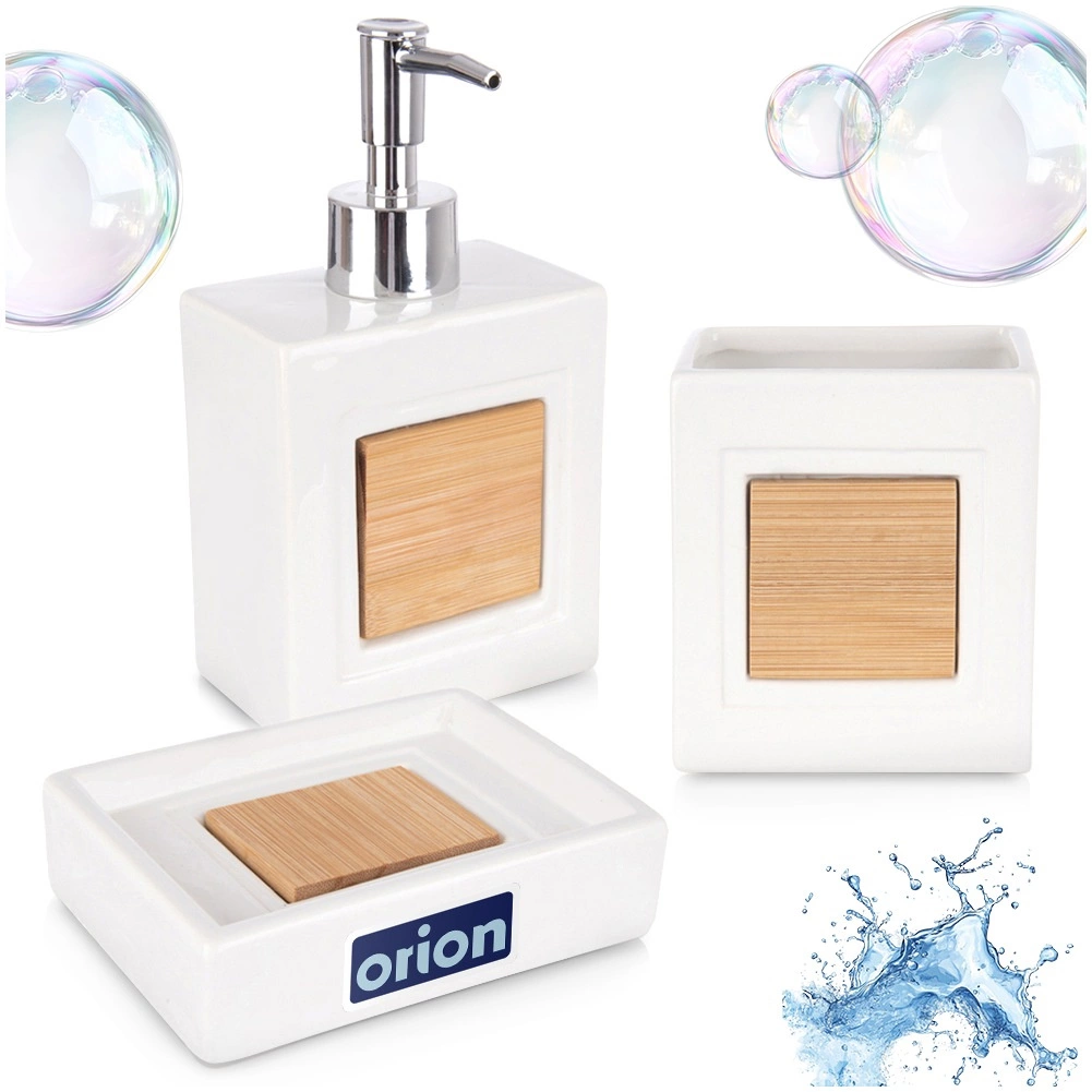 A szett része a folyékony szappan adagolója precíz adagolással, egy pohár fogkefékhez vagy kozmetikai kiegészítőkhez, valamint egy szappantartó a szilárd szappan higiénikus tárolásához. Ideális fürdőszobába és mellékhelyiségbe – segít rendet és elegáns megjelenést fenntartani a mosdónál.