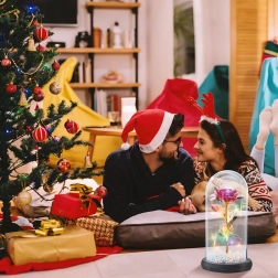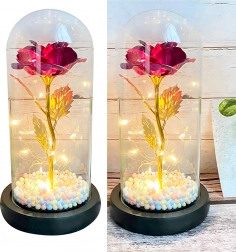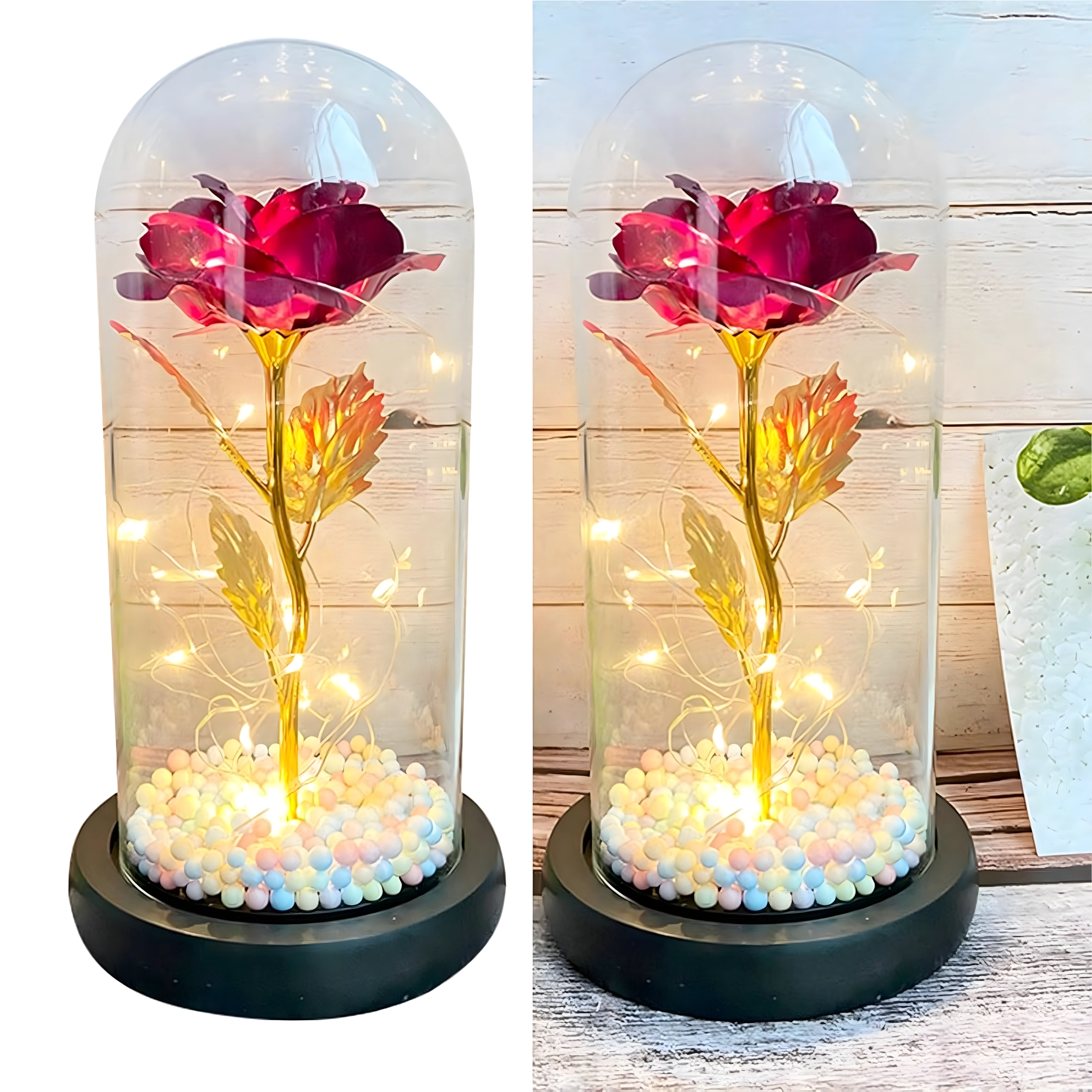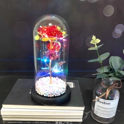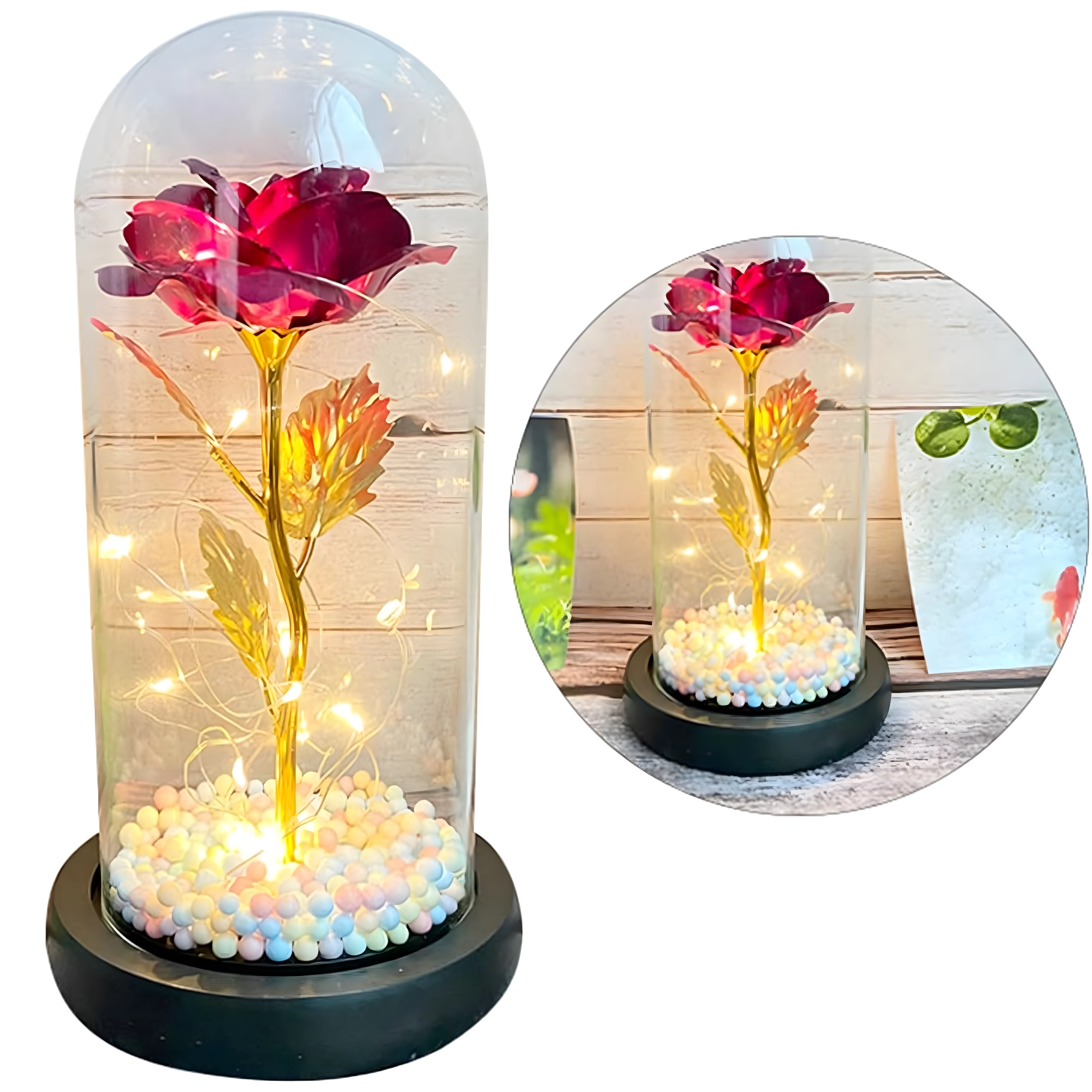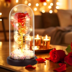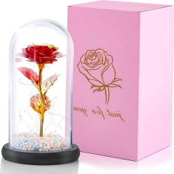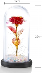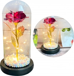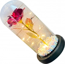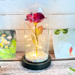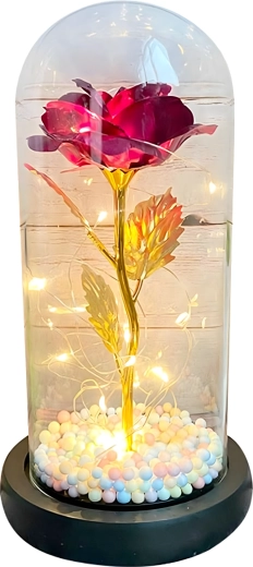 Elbűvölő dekoráció, amely egyesíti a rózsa szépségét és a meleg fényt. Az üveg búra megvédi a virágot a portól, míg a LED fényfüzér finom csillogást hoz létre az arany száron és leveleken. A talpban lévő színes/pasztell gyöngyök könnyed, játékos akcentust adnak.