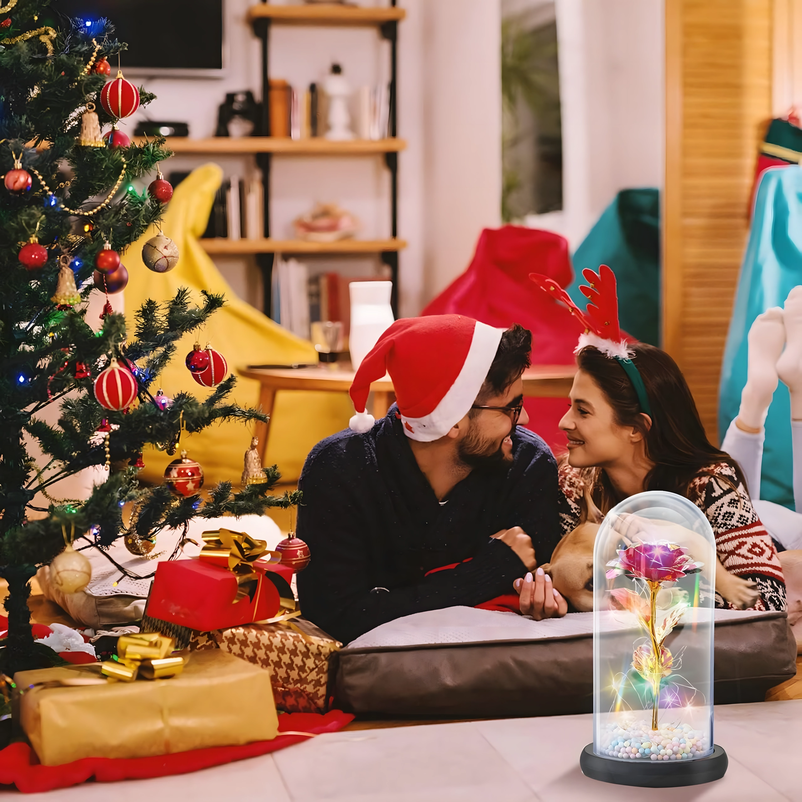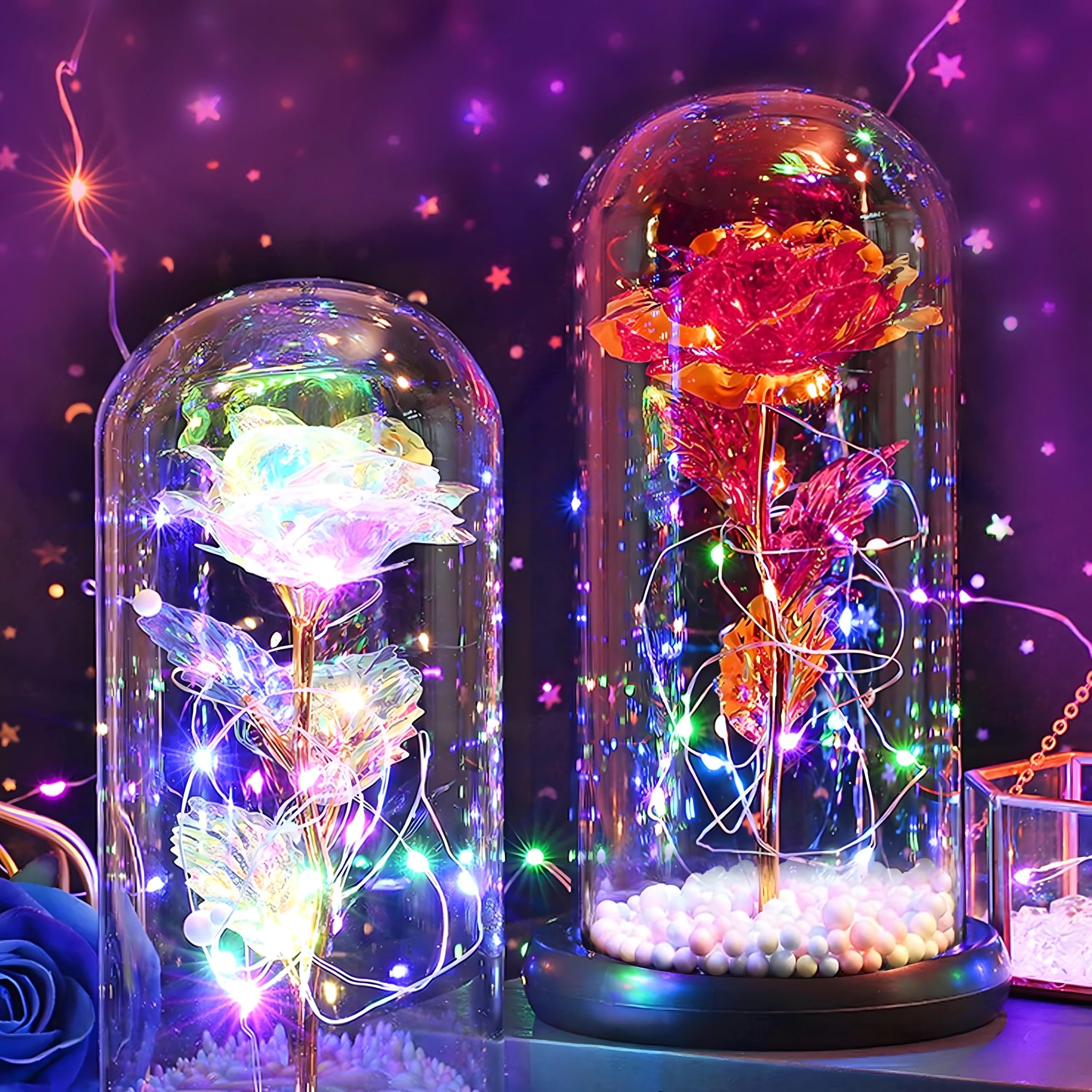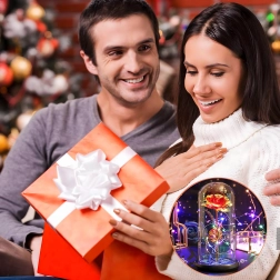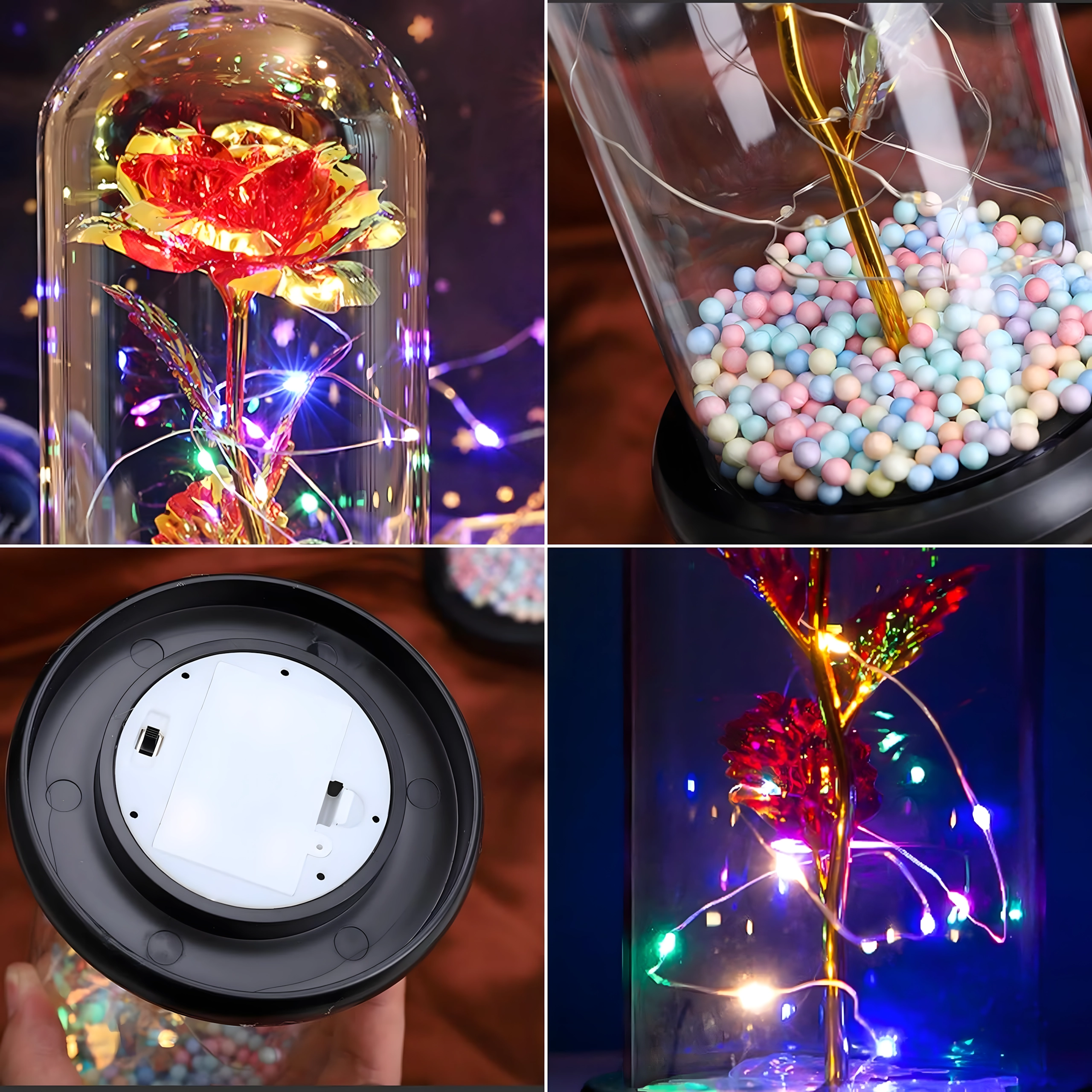 Elbűvölő dekoráció, amely egyesíti a rózsa szépségét és a meleg fényt. Az üveg búra megvédi a virágot a portól, míg a LED fényfüzér finom csillogást hoz létre az arany száron és leveleken. A talpban lévő színes/pasztell gyöngyök könnyed, játékos akcentust adnak.