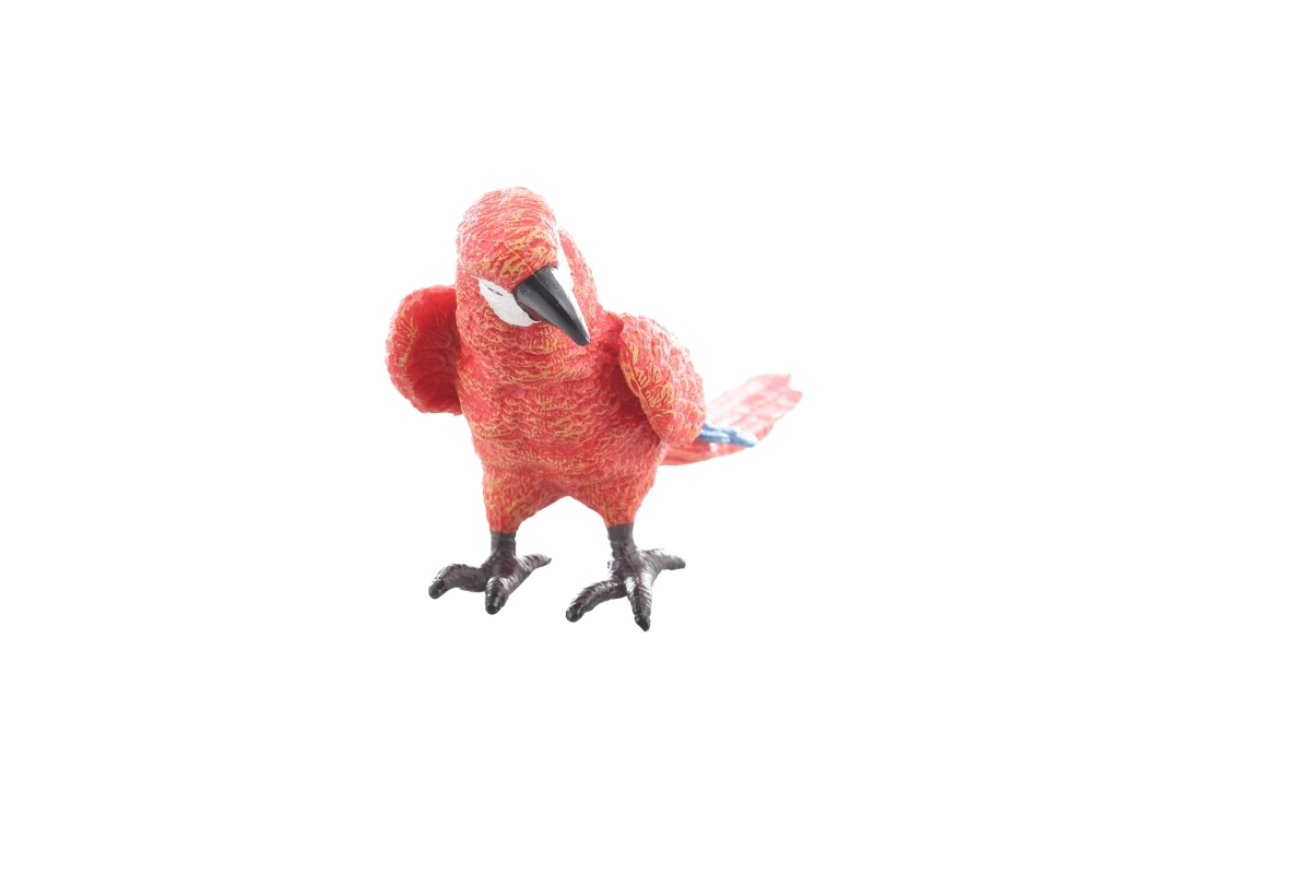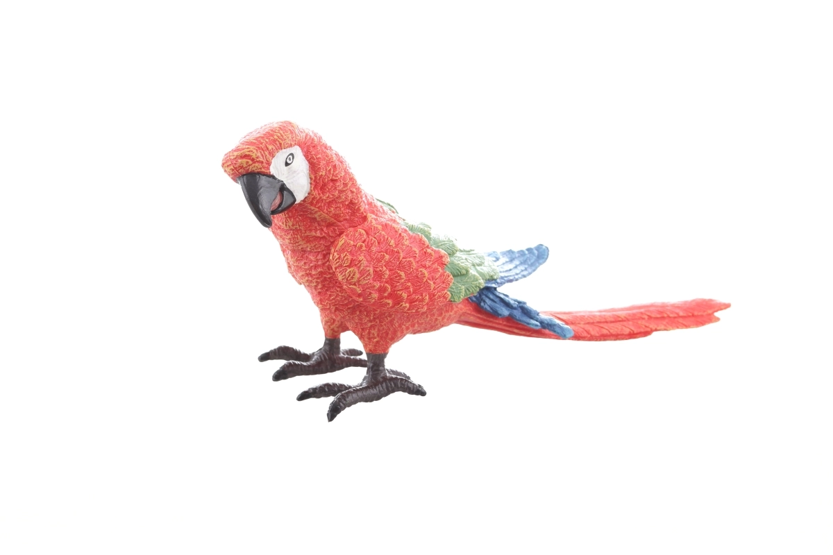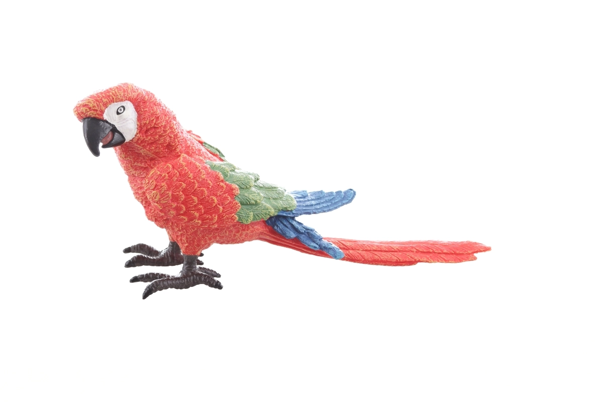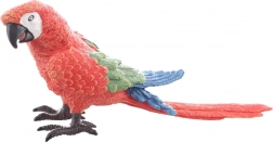 Élethű tollstruktúra, ragyogó piros színezet kékeszöld akcentusokkal és jellegzetes csőralak az autentikus ara megjelenésért.