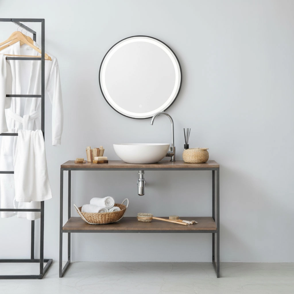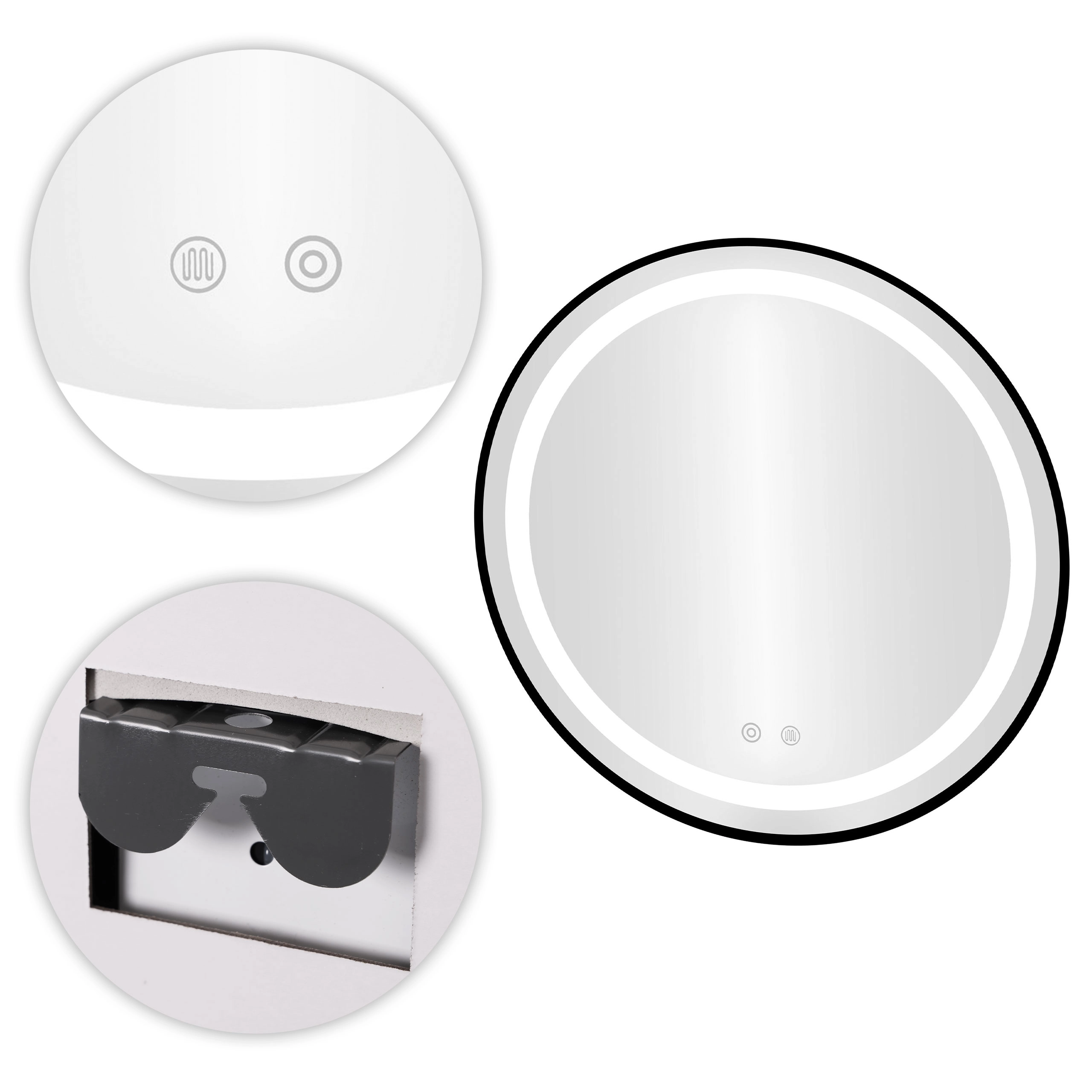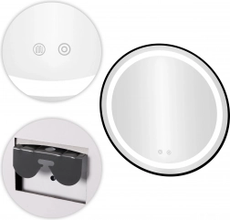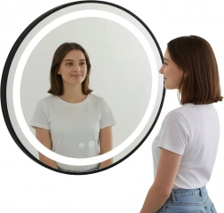 Elegáns, 60 cm átmérőjű kerek fürdőszobatükör a kerületén futó, finom LED háttérvilágítással és érintőkapcsolóval. 3 fény színét kínálja (3000/4000/6500K) és fokozatmentes fényerő-szabályozást a tökéletes sminkeléshez, borotválkozáshoz és esti relaxációhoz. A fekete keretes modern design remekül illik bármely enteriőrbe.