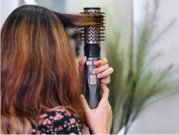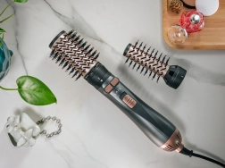 A kevert sörték gyengéden megfogják a tincseket húzás nélkül, a forgó fej pedig tövetől ad volument, és percek alatt sima hullámokat vagy elegáns loknikat formáz.