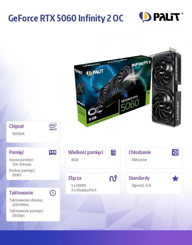 A Palit GeForce RTX 5060 INFINITY 2 OC a modern NVIDIA architektúrára épít, és olyan játékosoknak, illetve alkotóknak szól, akik hangolás nélküli teljesítményt szeretnének. A minimalista, végtelen motívummal díszített dizájn támogatja a zavartalan légáramlást és a letisztult esztétikát, amely a legtöbb házba illeszkedik.