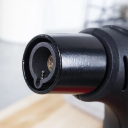 Az égő tartós fémből és minőségi műanyagból készült, folyamatos gázszabályozással rendelkezik, szeleppel a könnyű utántöltéshez normál öngyújtó-gázzal, valamint folyamatos üzemmóddal a reteszelésnek köszönhetően. A csúszásmentes markolat biztos fogást ad, a biztonsági zár pedig véd a véletlen begyújtástól és a gyermekektől.