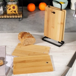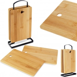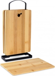 A bambusz természetesen ellenáll a nedvességnek és a vetemedésnek, gyorsan szárad, és nem veszi át a szagokat. A sima felület kellemes munkát biztosít és kíméli a pengéket. A praktikus nyílásnak köszönhetően a deszkák könnyen hordozhatók és felakaszthatók. A készlet alkalmas mindennapi szeleteléshez és stílusos tálaláshoz sajtok, pékáruk vagy snackek számára.