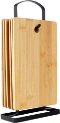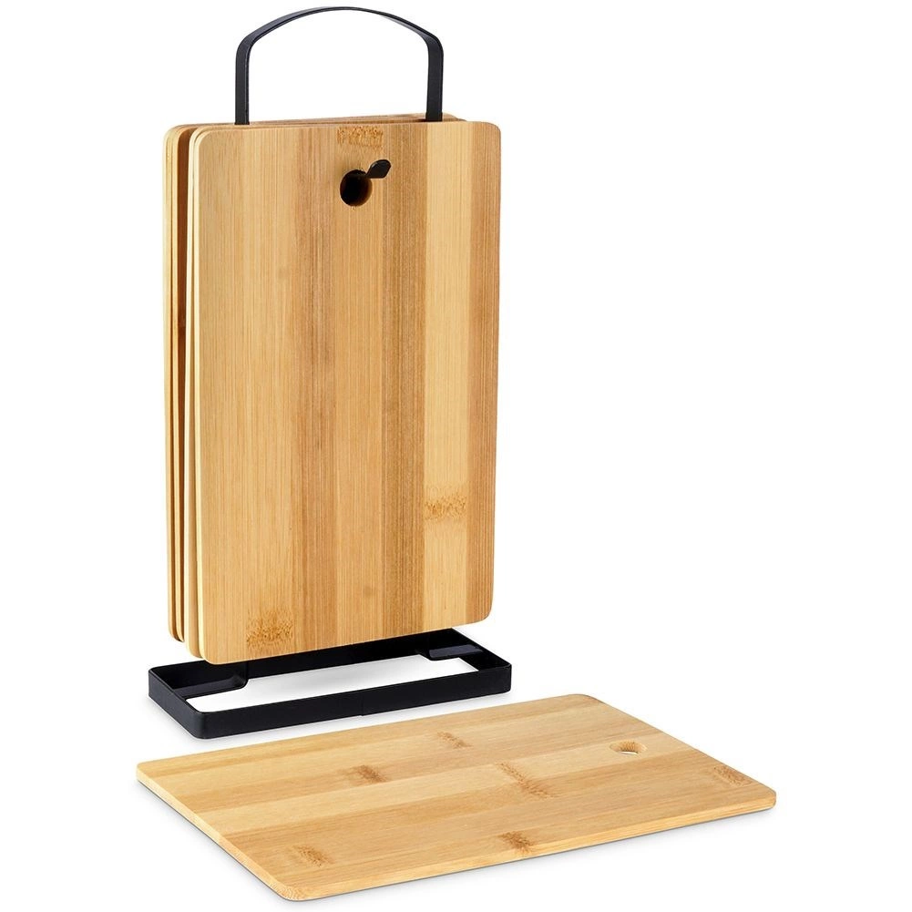 Hat darab bambusz konyhai vágódeszka elegáns fekete tartóban, amely rendet és stílust visz minden konyhába. Minden deszka mérete 22 × 14 × 0,4 cm, a tartóé 15 × 6 × 29 cm, így könnyen elfér a munkalapon és mindig kéznél tartja a deszkákat.