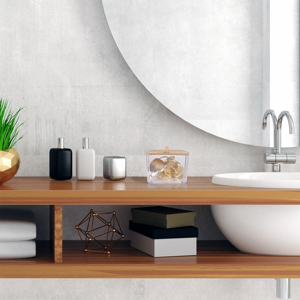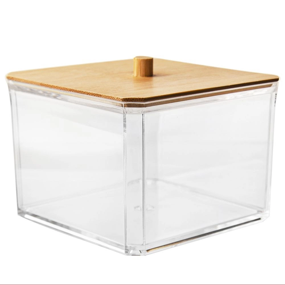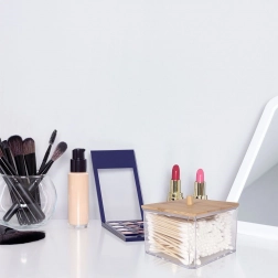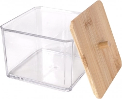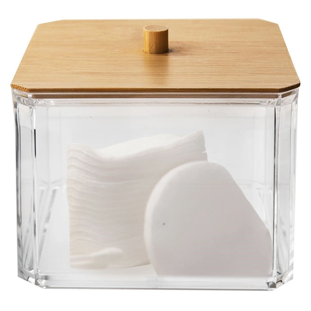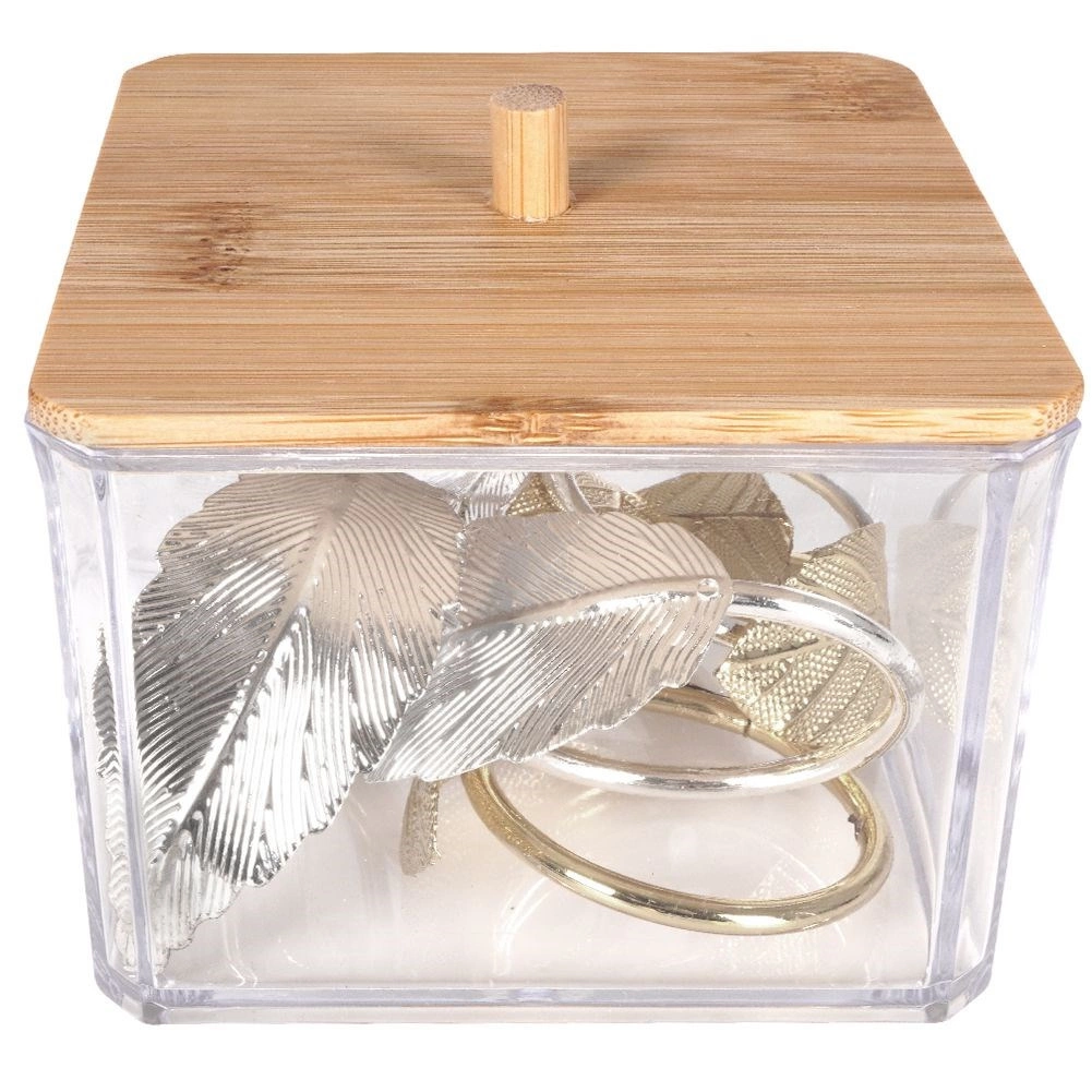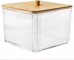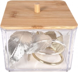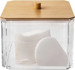 Ez az elegáns vattapálcika-tartó doboz az átlátszó, tartós műanyag falakat a bambusz fedél természetes megjelenésével és praktikus fogantyújával ötvözi. Remekül illik a fürdőszobába, hálószobába vagy a sminksarokba – a kisebb holmikat áttekinthetően és pormentesen tartja.