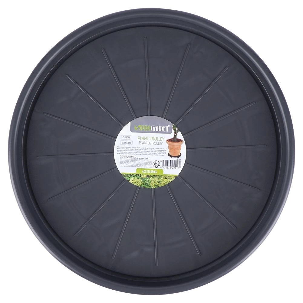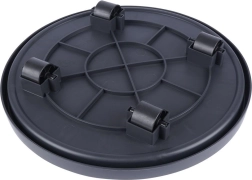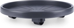 Praktikus, 35 cm átmérőjű gurulós virágcserép-alátét, legfeljebb 50 kg teherbírással, amely megkönnyíti a nehéz cserepek erőfeszítés nélküli áthelyezését. A négy kerék egyenletes mozgást biztosít, a megemelt perem pedig biztonságosan a helyén tartja a cserepet. A sötétszürke színű, tartós műanyag kivitel beltéri és kültéri használatra egyaránt alkalmas, és megóvja a padlót a karcolásoktól és a nedvességtől.