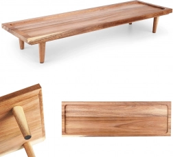 Elegáns, akácfából készült deszka stabil lábakkal a stílusos tálaláshoz és szeleteléshez. Megemelt kialakítást kínál a könnyű tálaláshoz, védő, megemelt peremet az ételek lecsúszása ellen, valamint természetes, tartós anyagot, amely nem veszi át a szagokat és gyorsan szárad.