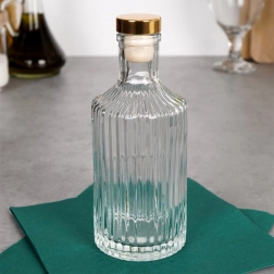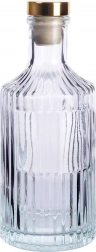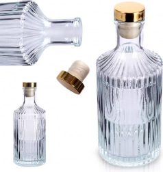 Stílusos, átlátszó üvegpalack modern bordázott dizájnnal és díszes arany parafadugóval, alkalmas italok tálalására és tárolására. A kompakt méretek megkönnyítik a kezelést, és kevés helyet foglal a hűtőben vagy a polcon. A palack könnyen tisztítható, és mindennapos használatra is megfelelő otthon és vendéglátásban.