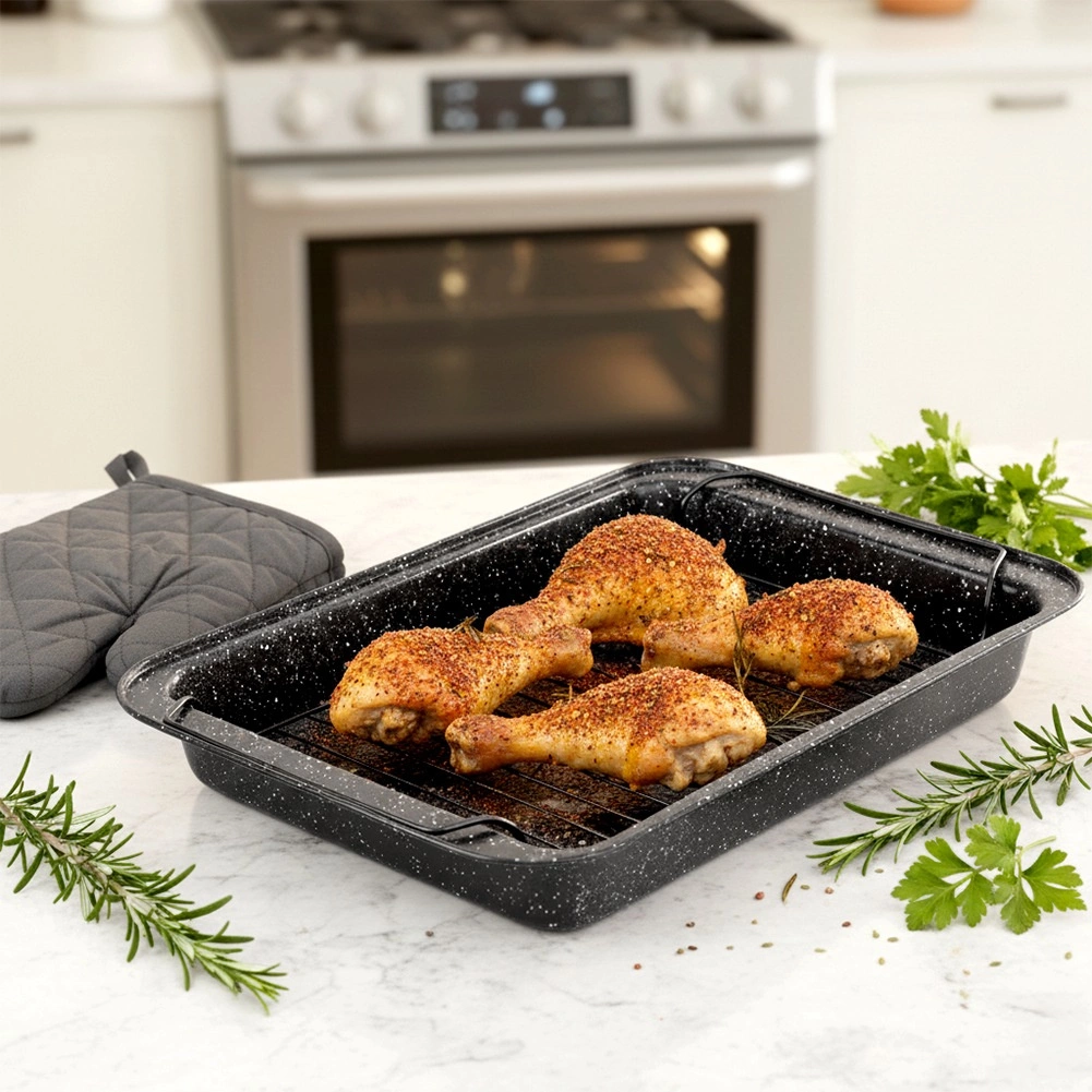 Ez a masszív tepsi 37,5 × 25,5 × 5 cm-es mérettel remek választás a mindennapi főzéshez és ünnepi sütéshez is. A tapadásmentes gránit bevonat megakadályozza az odaégést minimális zsiradék mellett is, így egészségesebb ételkészítést tesz lehetővé. A kivehető fémrács a húst a szaft fölött tartja, így minden oldalról egyenletesen sül.
