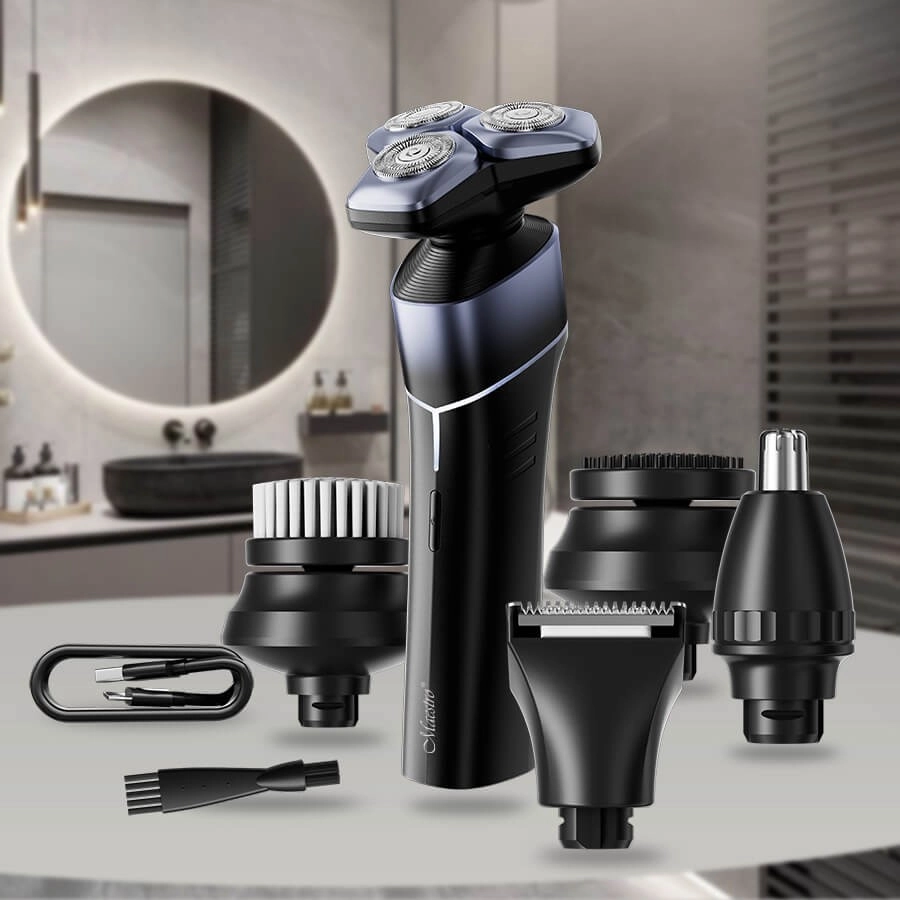Multifunkciós szett modern férfiaknak: a MAESTRO 5 az 1-ben ötvözi a simára borotválást, a haj- és szakállvágást, az orr‑ és fülszőrnyírót, az arctisztító kefét és a masszázsfejet. A 600 mAh-s akkumulátornak, a USB‑C töltésnek, az IPX7 vízálló háznak és az akár 60 perces üzemidőnek köszönhetően ideális a fürdőszobába és utazáshoz is.