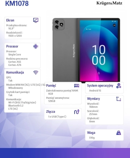 A modern KRÜGER&MATZ Eagle 1078S tablet 11" IPS kijelzőt 1920 × 1200 felbontással, 90 Hz-es gördülékenységet, nagy teljesítményű 8 magos MediaTek processzort és 8 GB RAM-ot kínál a gyors munkához és szórakozáshoz. A 256 GB tárhellyel (microSD-vel bővíthető), LTE-vel, Wi‑Fi ac-val, Bluetooth 5.2-vel és 7000 mAh akkumulátorral készen áll az egész napos használatra, videóhívásokra és multimédiára.