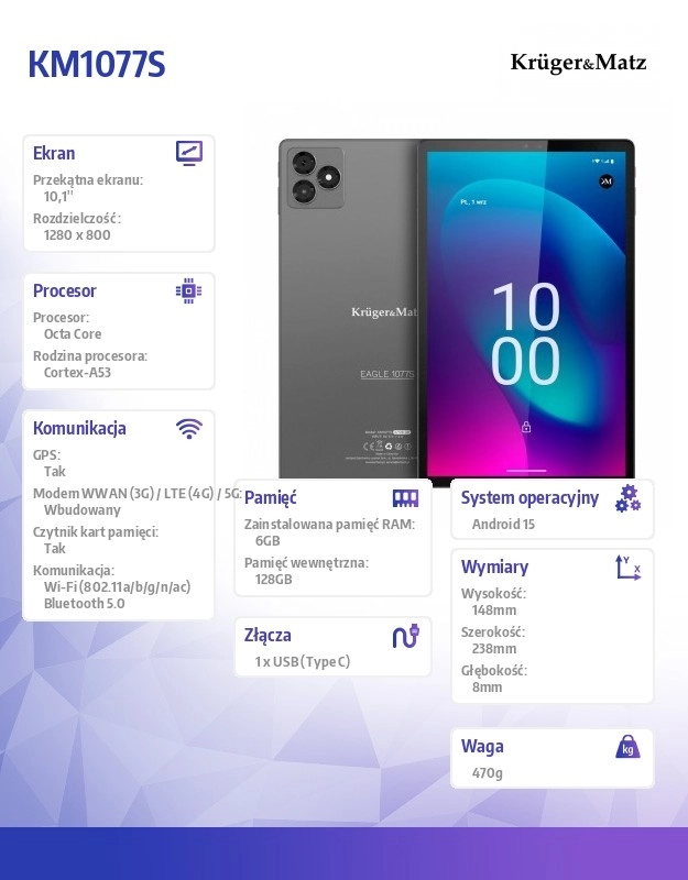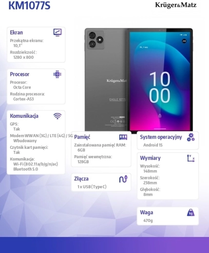 Elegáns és nagy teljesítményű Krüger&Matz Eagle 1077S tablet, ideális munkához és szórakozáshoz. 10,1" IPS kijelzővel, nyolcmagos MediaTek processzorral, 6 GB RAM-mal, gyors LTE kapcsolattal, nagy 128 GB tárhellyel bővíthető opcióval és hosszú üzemidővel a 6000 mAh-s akkumulátornak köszönhetően.