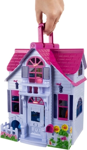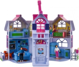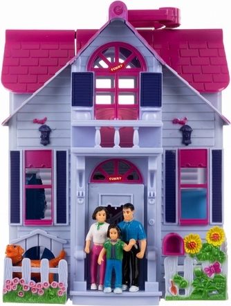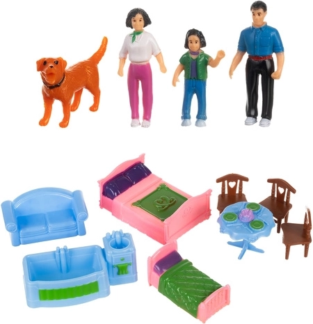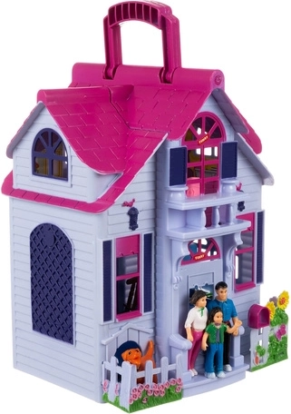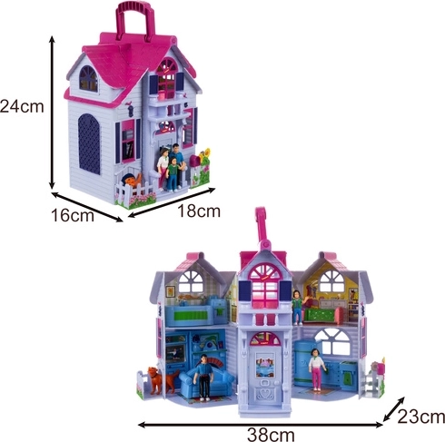 Ez az összecsukható babaház a valósághű otthoni jelenetekkel nyűgözi le a gyerekeket. Kinyitva teljesen hozzáférhető belsőt kapunk előszobával, konyhával, kandallós nappalival, fürdőszobával, hálószobával és gyerekszobával. A készlet tartalmaz egy családot (anya, apa, gyermek), egy kutyust és bútorokat, így a gyerekek azonnal kitalálhatnak történeteket és fejleszthetik fantáziájukat.