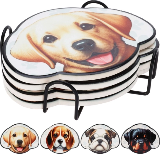 Stílusos, négy darabos poháralátét-szett kutyás motívumokkal és praktikus fém állvánnyal. Minden alátét tartós dolomitból készült, alul parafa réteggel a felületek védelméért. Védi az asztalt a foltoktól és a karcolásoktól, nem foglal sok helyet, és remekül kiegészíti a konyhát, az étkezőt és az irodát.