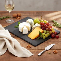 A lap természetes palakőből készült, amely tartósságáról és jó hőtartó képességéről ismert – használat előtt lehűthető a hideg ételekhez, vagy enyhén előmelegíthető a meleg finomságokhoz. Az alsó oldal csúszásgátló alátétekkel van ellátva, amelyek megvédik az asztalt a karcolásoktól, és stabilitást biztosítanak szeletelés és tálalás közben.