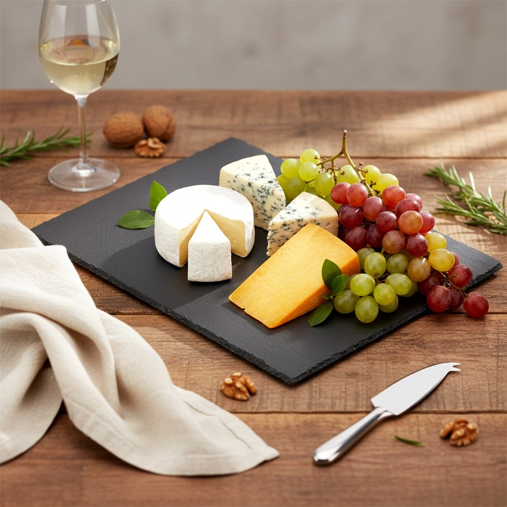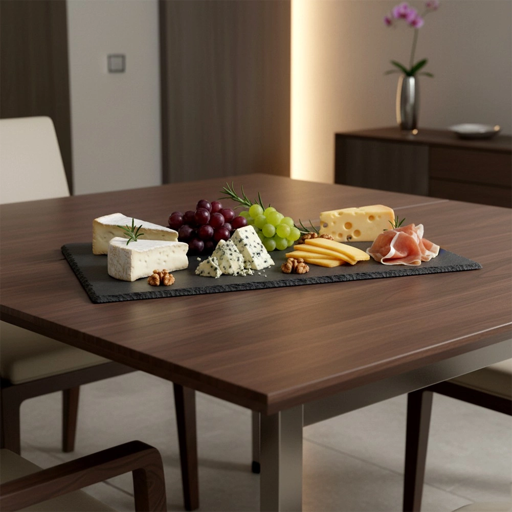 A természetes palakőből készült lap csiszolt élekkel és autentikus textúrával kiemeli a tálalt fogásokat, és modern megjelenést kölcsönöz az asztalnak.