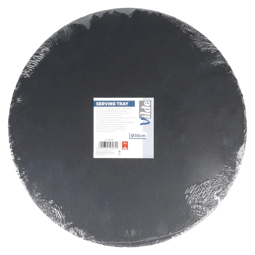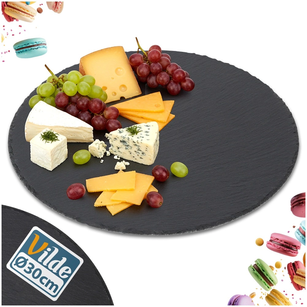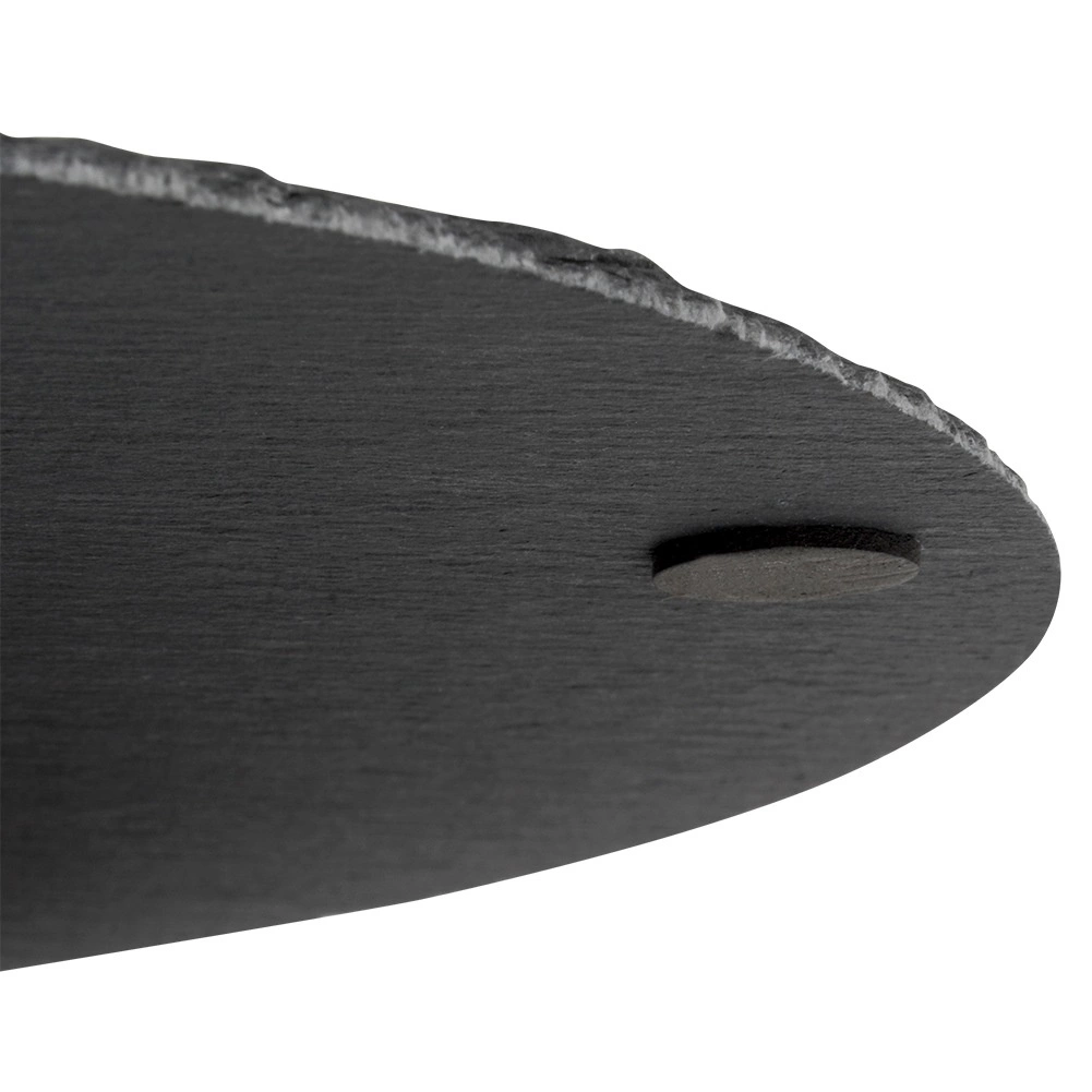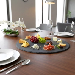 Ez a kerek, palából készült szervírozó tálca természetes eleganciát és funkcionalitást visz az asztalra. A természetes fekete pala finoman hasított struktúrája és kézzel megmunkált élei látványos megjelenést biztosítanak, kiemelve a felszolgált ételeket. A csúszásgátló lábaknak köszönhetően stabil marad, és megvédi az asztalfelületet a karcolásoktól.