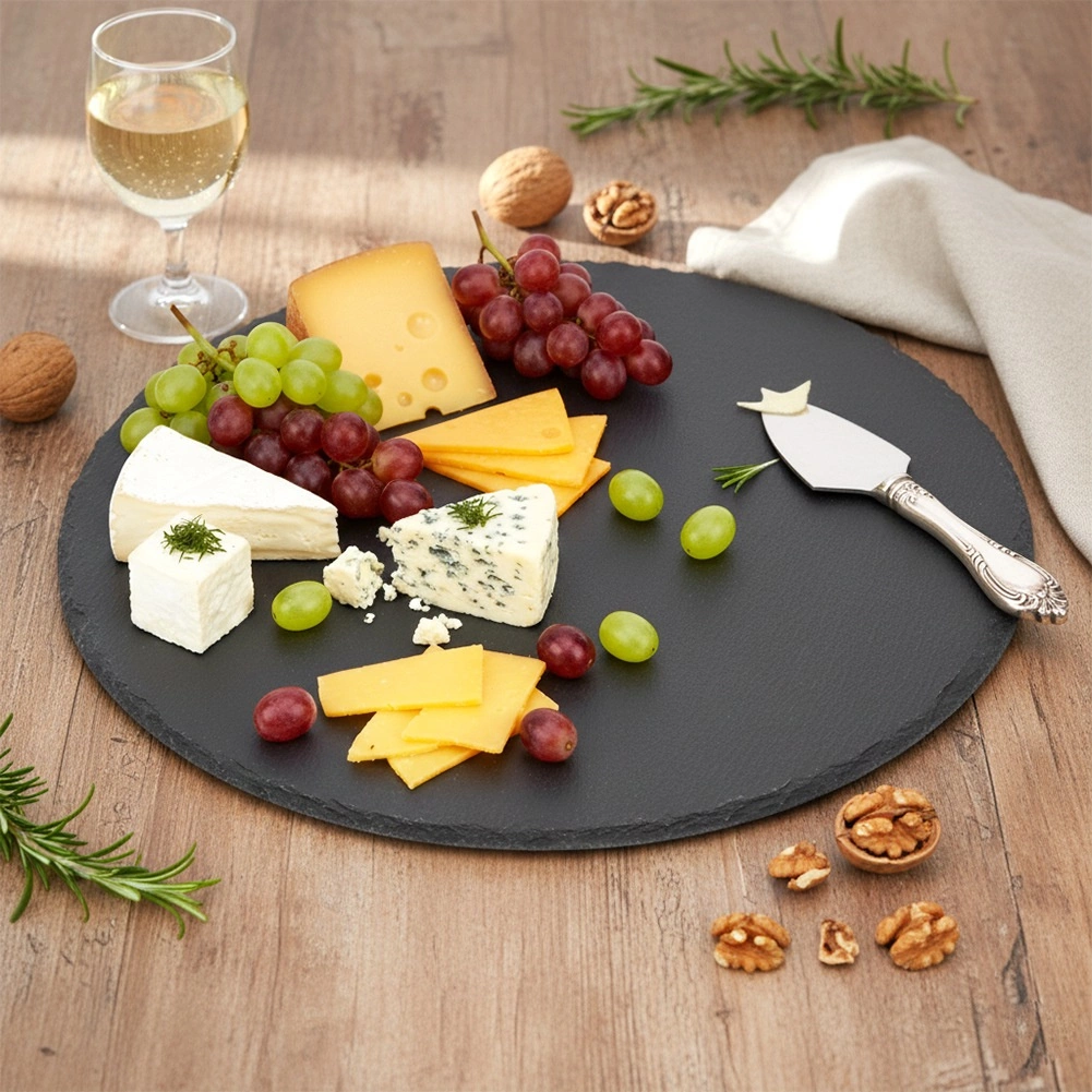 A matt kőfelület és a természetesen hasított élek elegáns megjelenést kölcsönöznek minden terítésnek – ideális sajttálakhoz, charcuterie összeállításokhoz és desszertekhez.