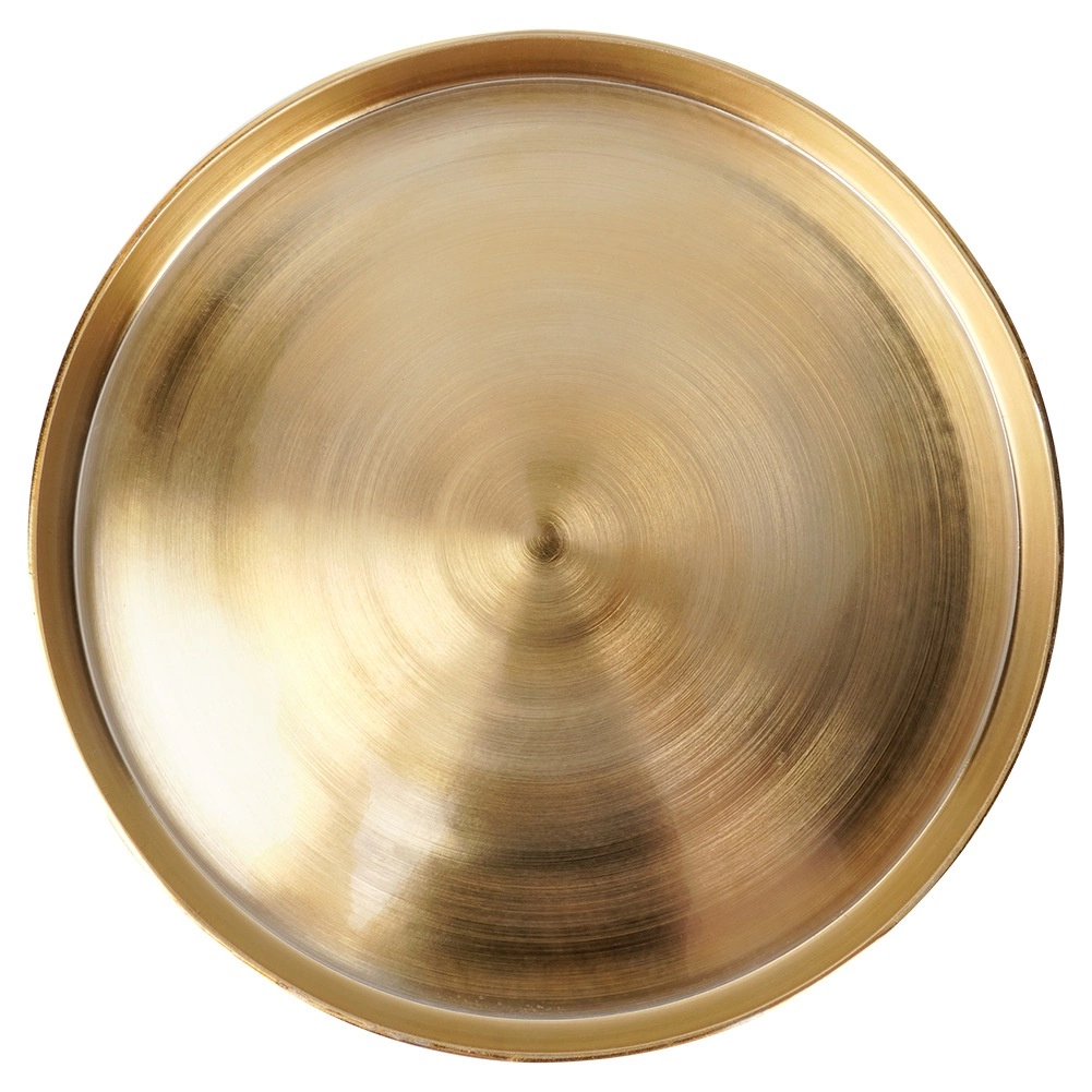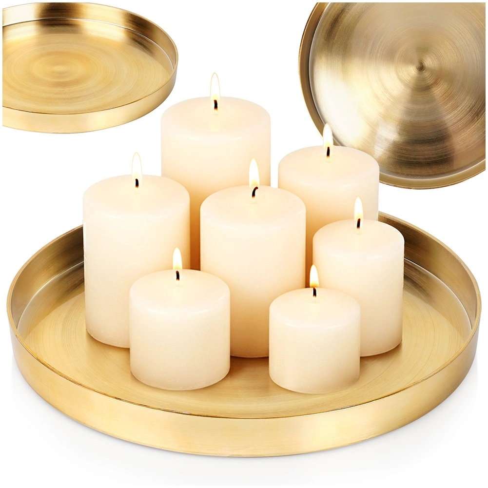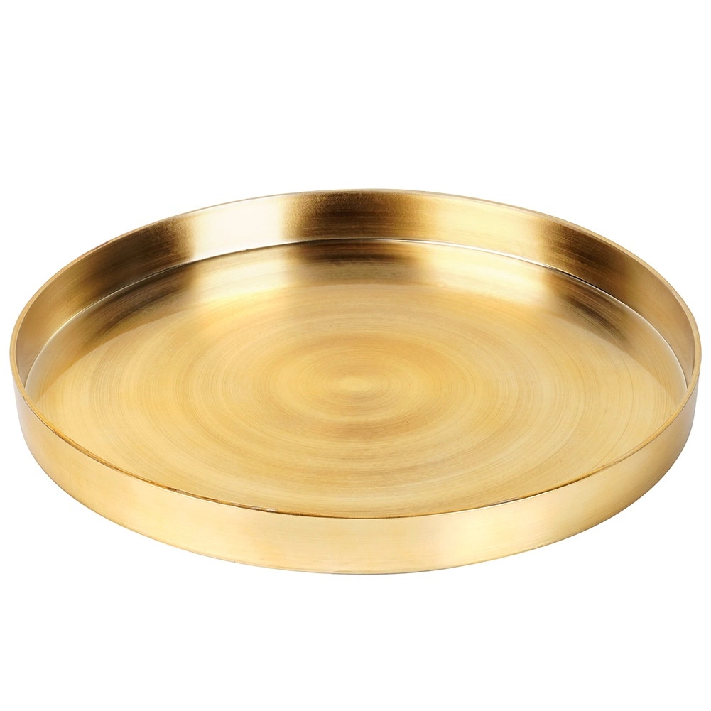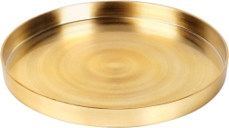 Elegáns, 32 cm átmérőjű, kerek tálca modern arany felületkezeléssel és megemelt peremmel, ideális gyertyák elrendezéséhez, dekorációkhoz vagy ékszerekhez. A stabil kialakítás védi a felületeket a viasztól és segít mindent rendezetten a helyén tartani.